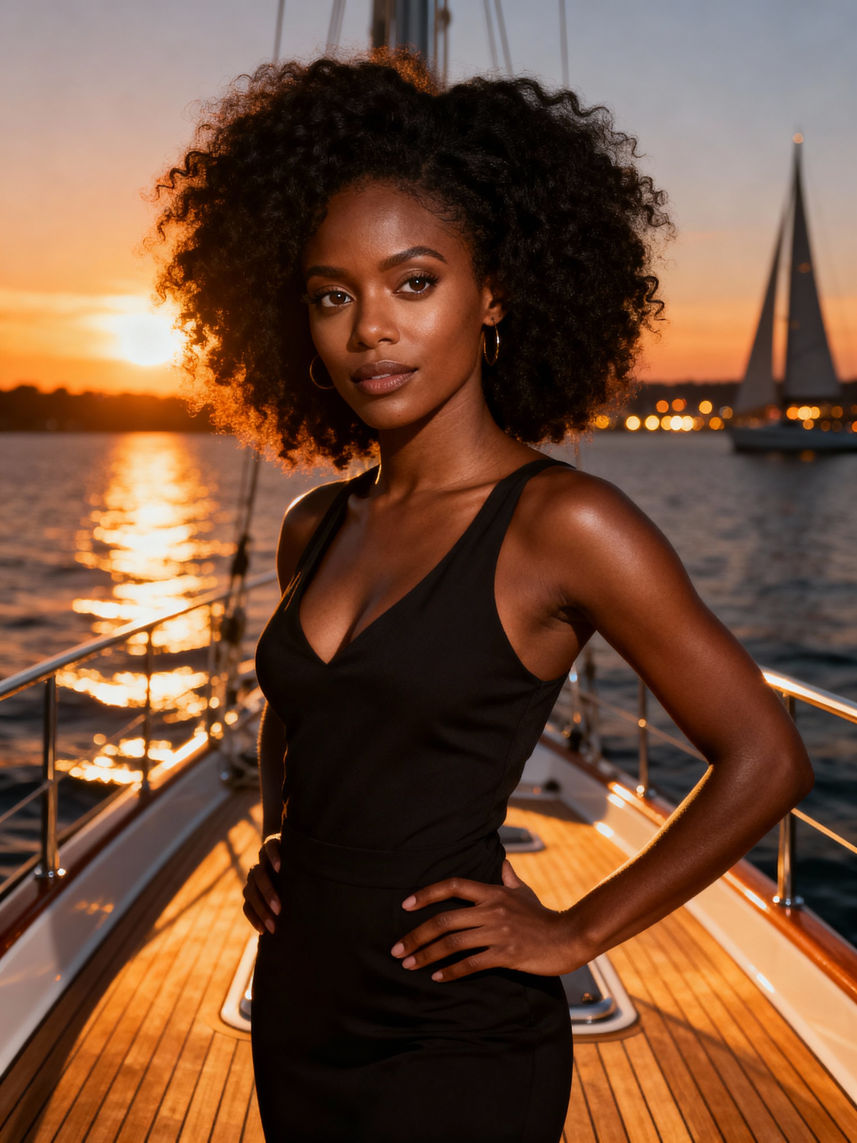 Full-body shot of model posing confidently, on a private yacht with the sunset in the background. Golden hour lighting.