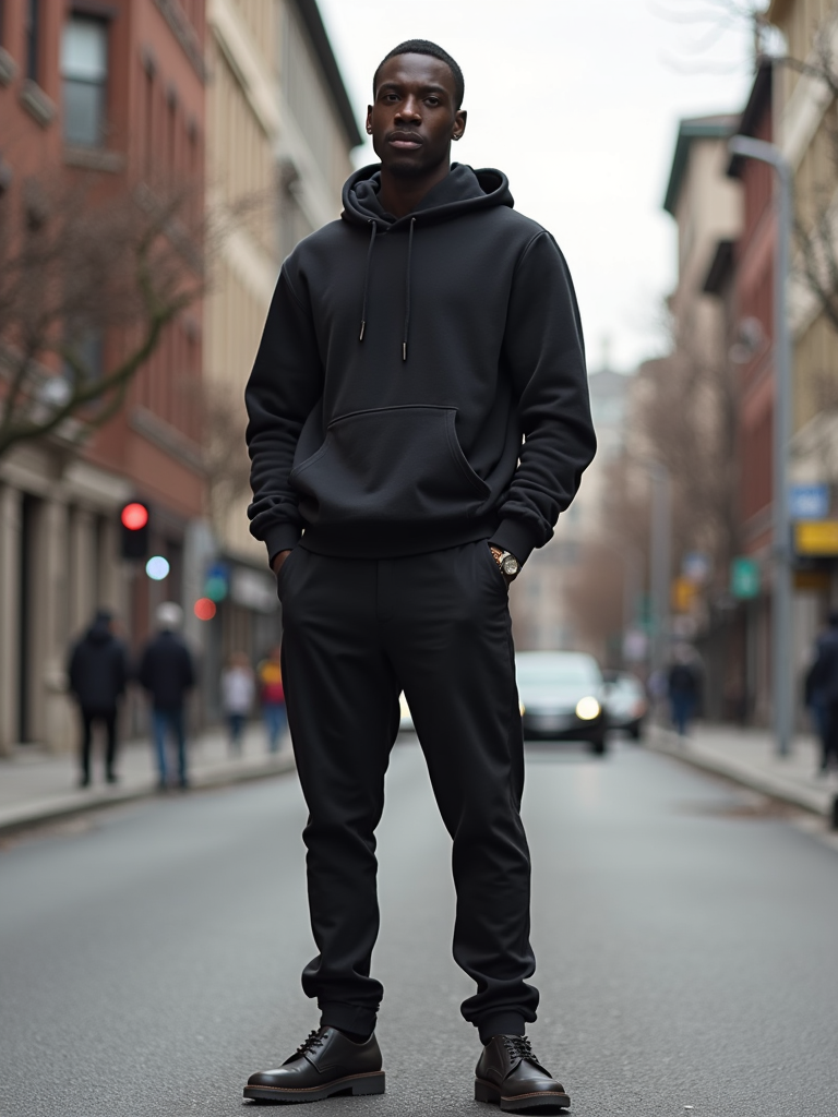 Full body street photography of model. Confident stance in city setting. Street photography style.