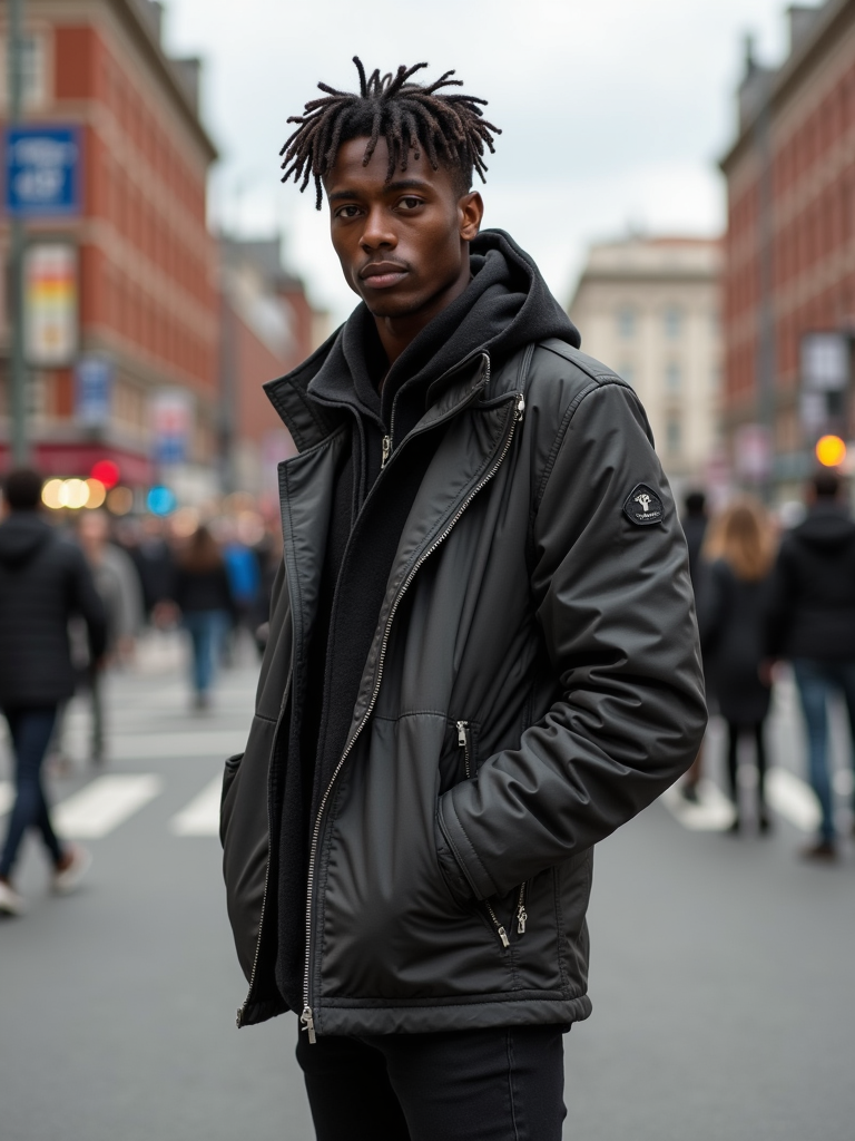Full body street photography of model. Confident stance in city setting. Street photography style.