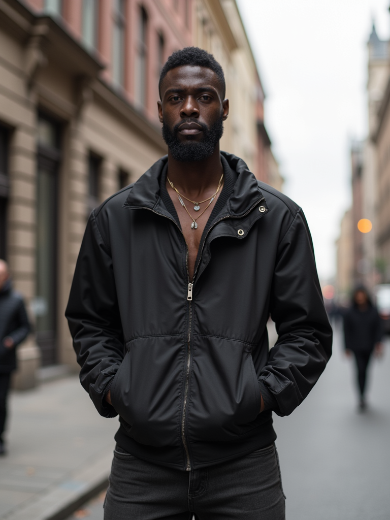 Full body street photography of model. Confident stance in city setting. Street photography style.