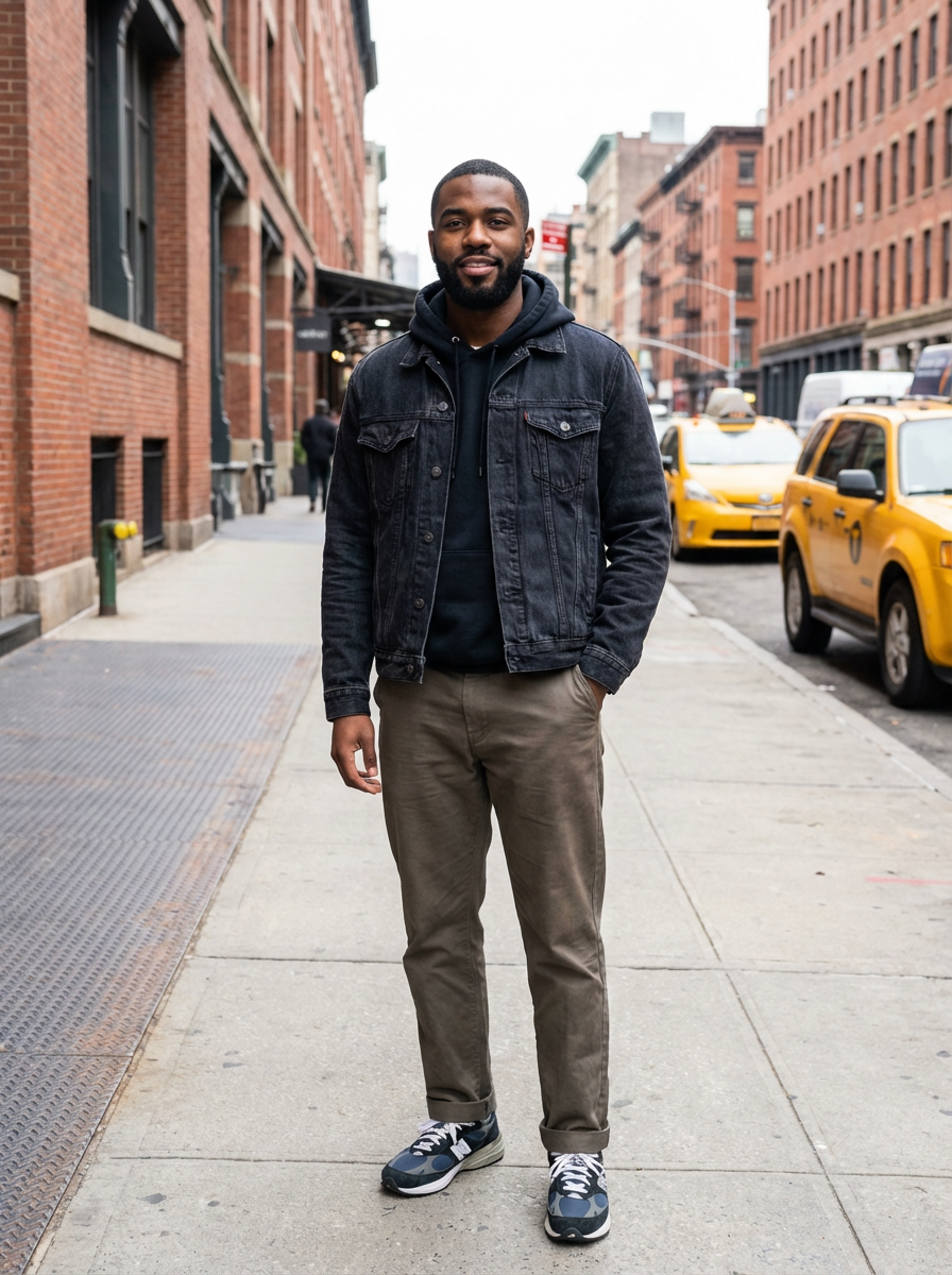 Full body street photography of model. Confident stance in city setting. Street photography style.