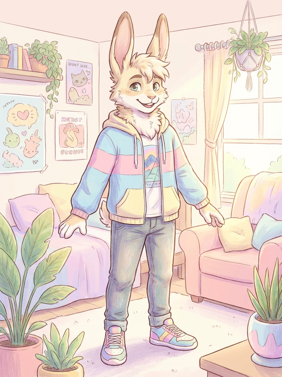 furry character of bunny fursona of model with handsome rabbit features, fluffy fur, and upright ears, wearing colorful casual wear, happy expression, detailed digital furry art style, pastel colors