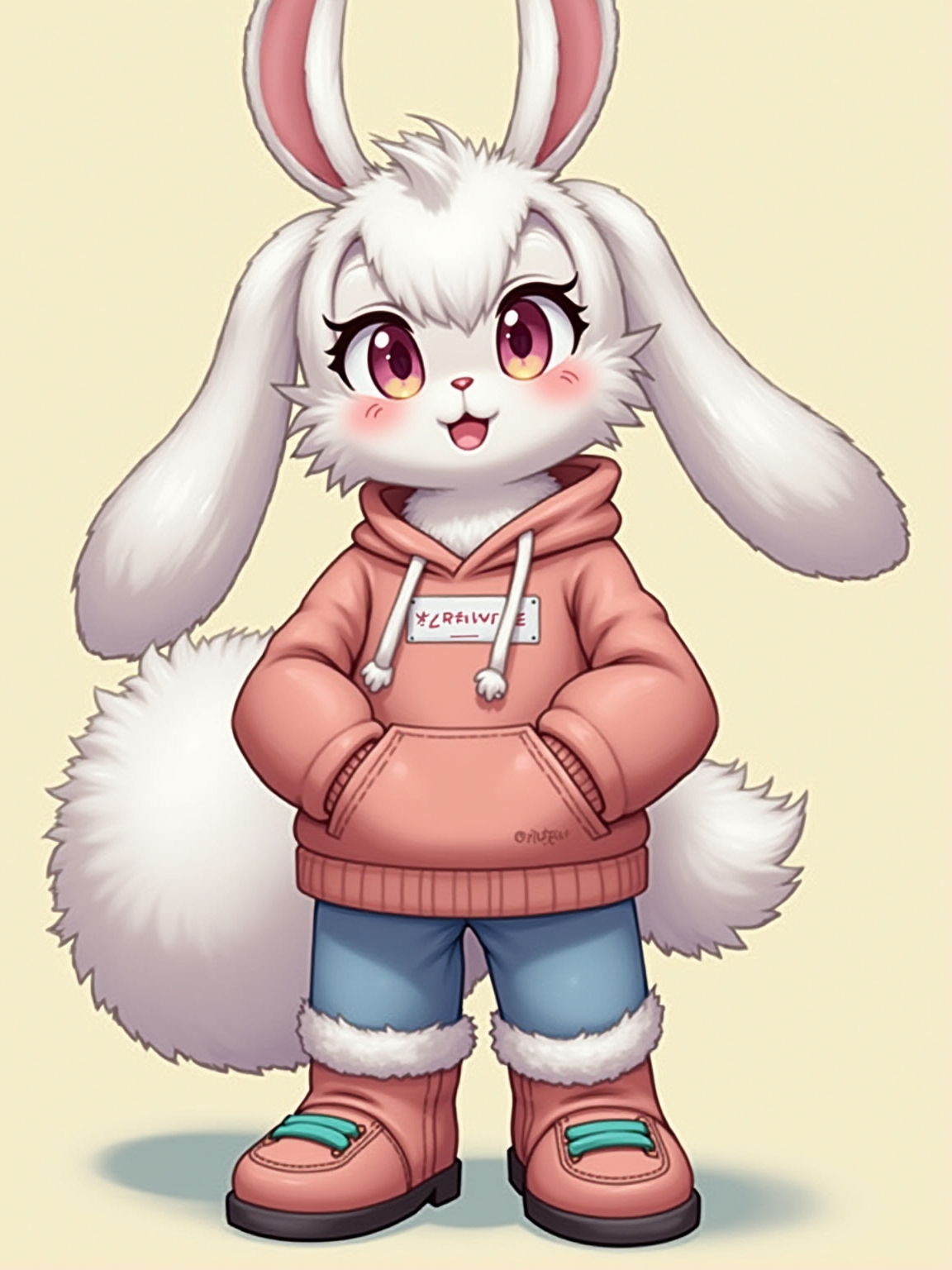 furry character of bunny fursona of model with cute rabbit features, soft fur, and long floppy ears , wearing colorful casual wear, happy expression, detailed digital furry art style, pastel colors