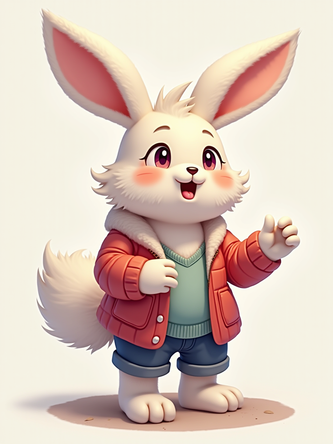 furry character of bunny fursona of model with cute rabbit features, soft fur, and long floppy ears , wearing colorful casual wear, happy expression, detailed digital furry art style, pastel colors