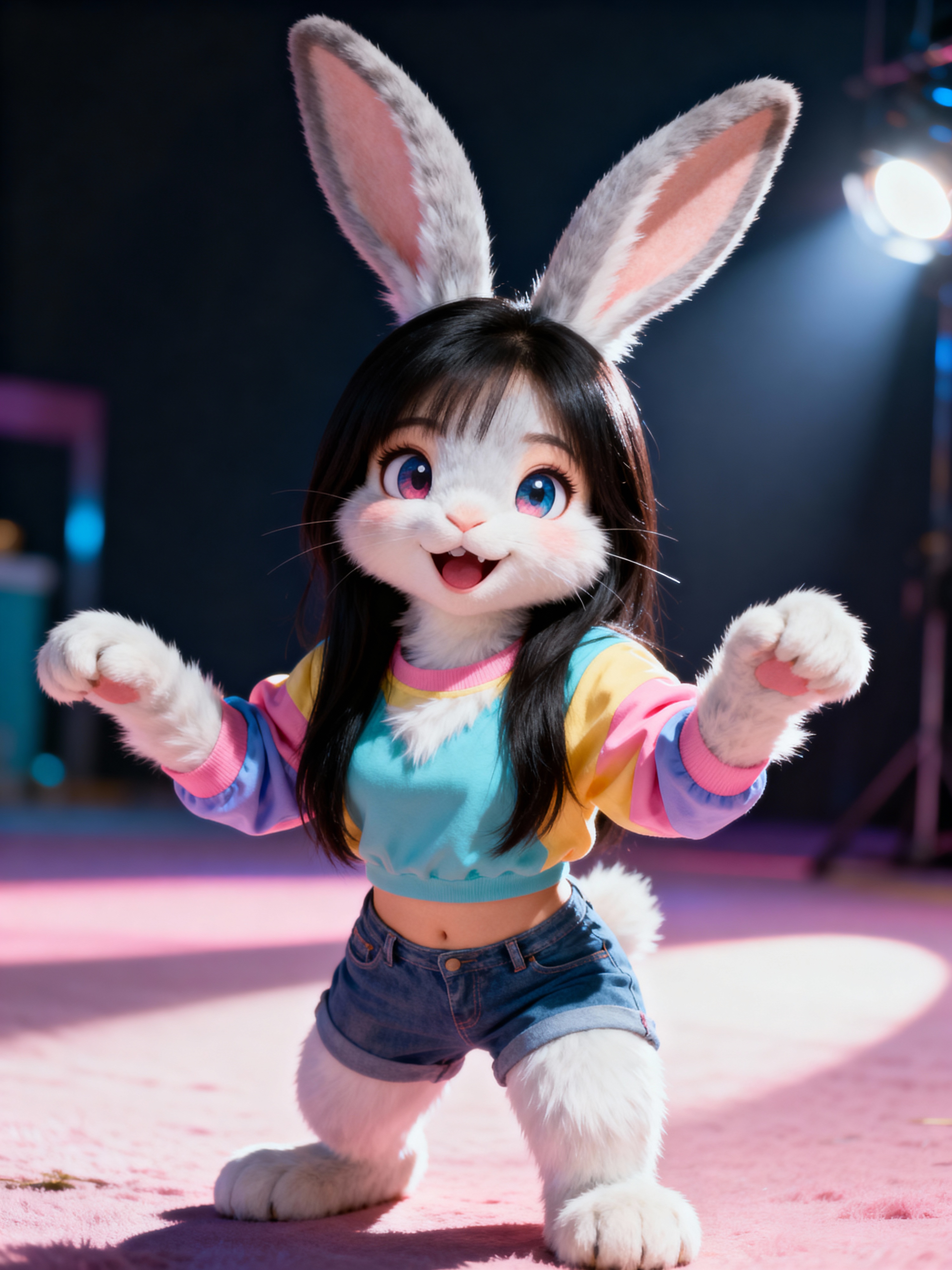 furry character of bunny fursona of model with cute rabbit features, soft fur, and long floppy ears , wearing colorful casual wear, happy expression, detailed digital furry art style, pastel colors