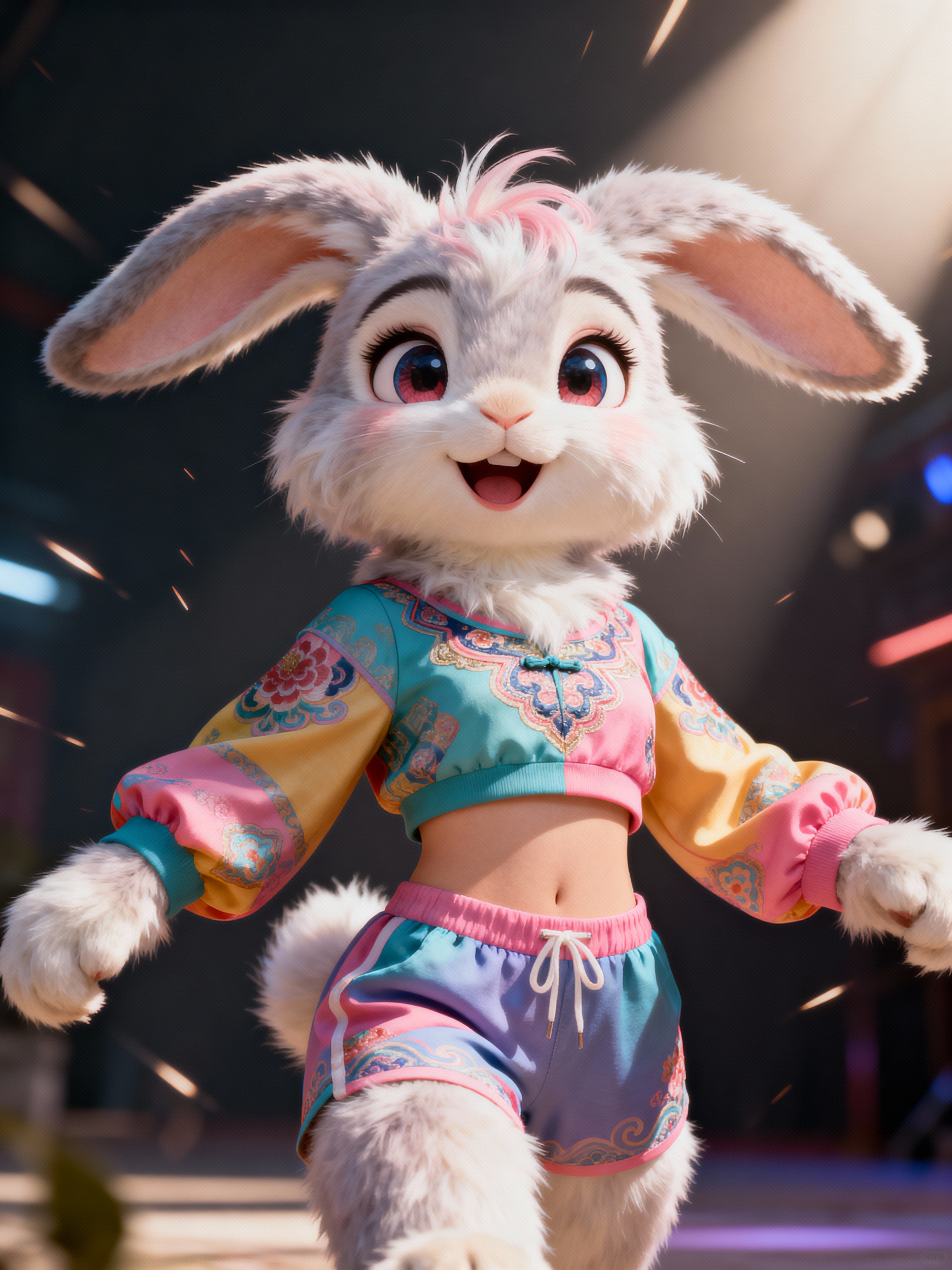 furry character of bunny fursona of model with cute rabbit features, soft fur, and long floppy ears , wearing colorful casual wear, happy expression, detailed digital furry art style, pastel colors