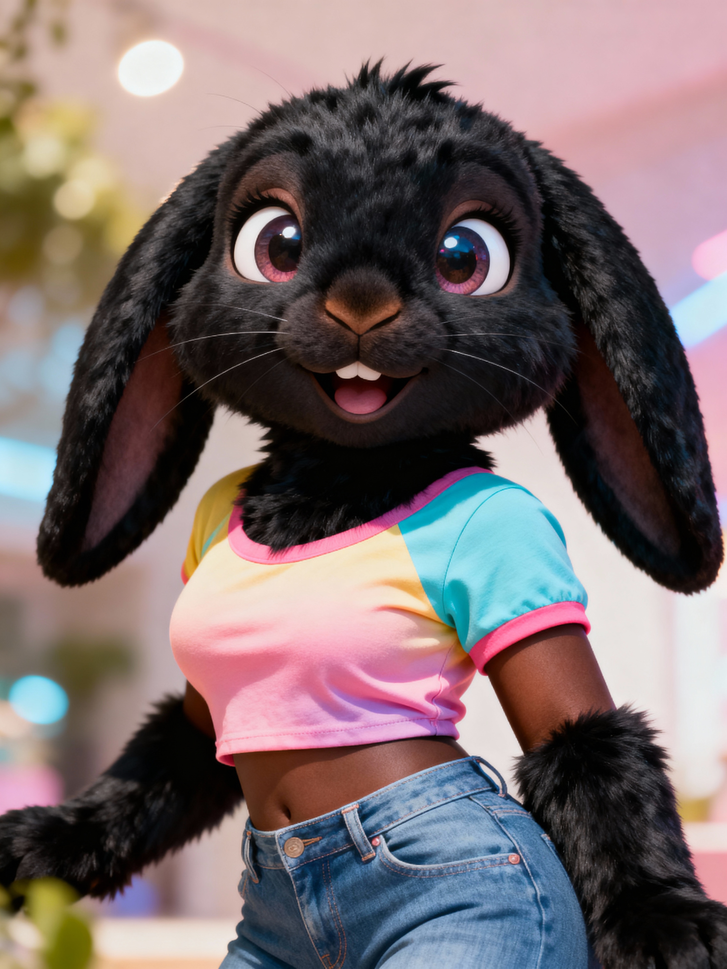 furry character of bunny fursona of model with cute rabbit features, soft fur, and long floppy ears , wearing colorful casual wear, happy expression, detailed digital furry art style, pastel colors