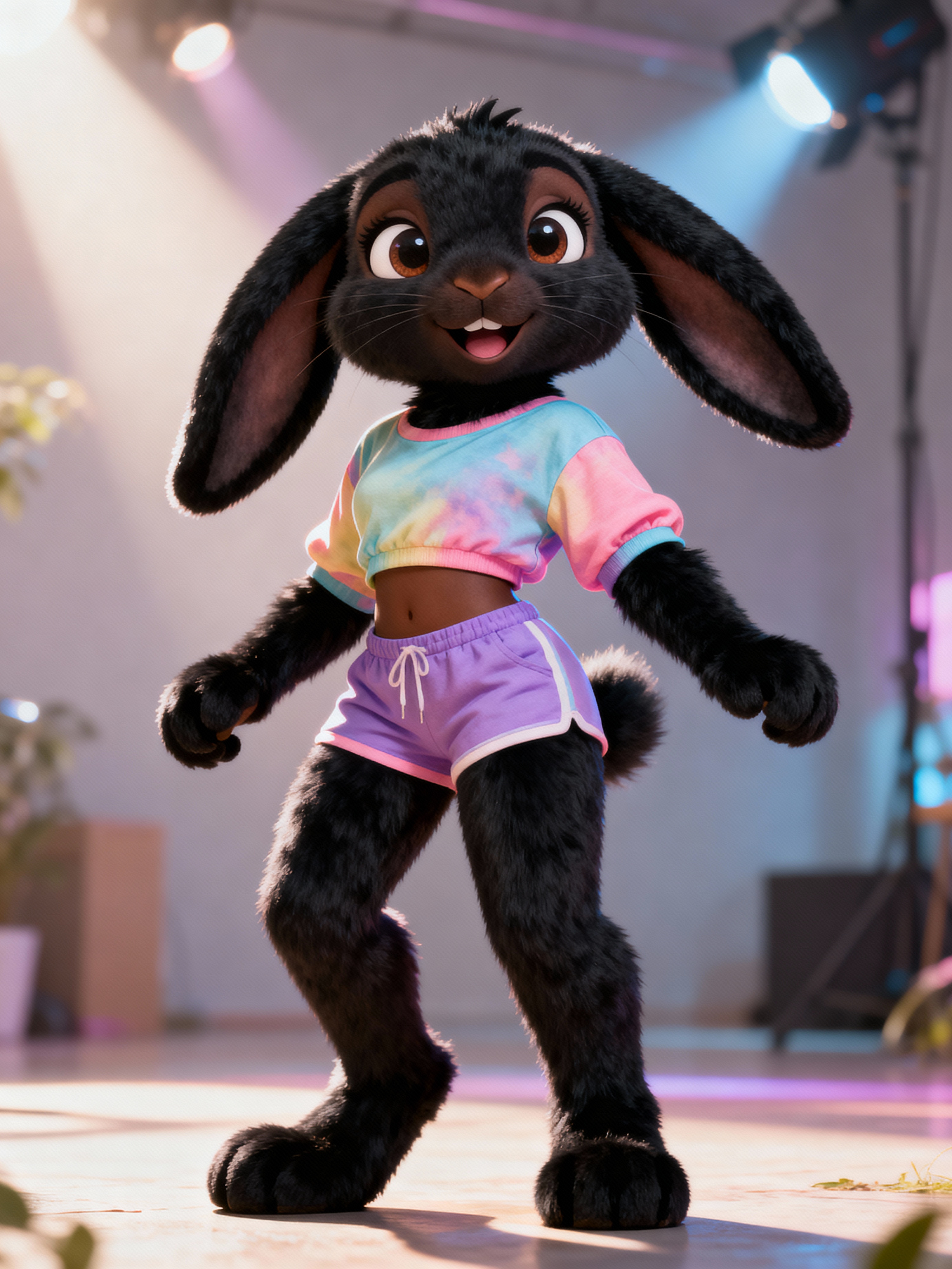 furry character of bunny fursona of model with cute rabbit features, soft fur, and long floppy ears , wearing colorful casual wear, happy expression, detailed digital furry art style, pastel colors