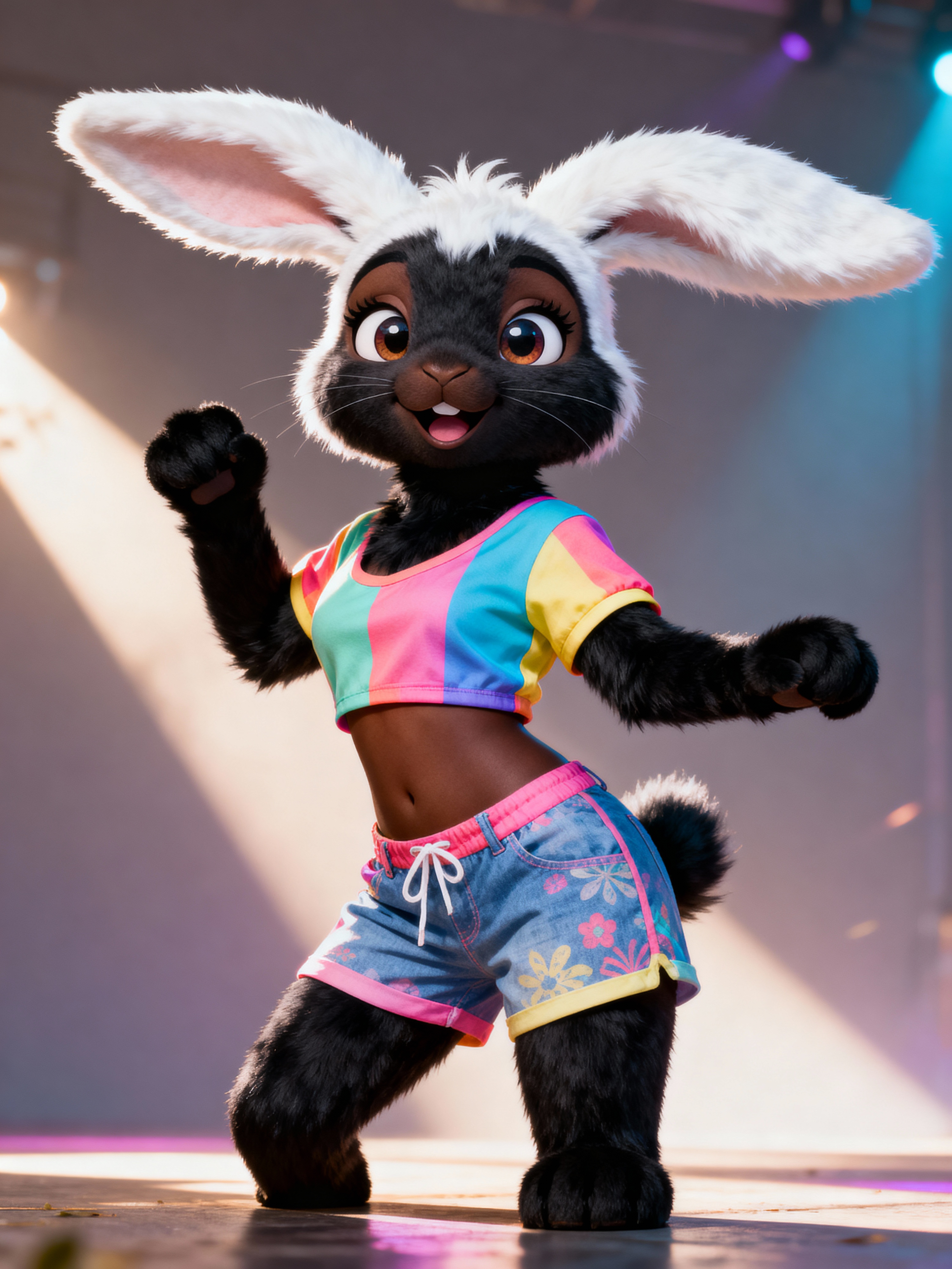 furry character of bunny fursona of model with cute rabbit features, soft fur, and long floppy ears , wearing colorful casual wear, happy expression, detailed digital furry art style, pastel colors