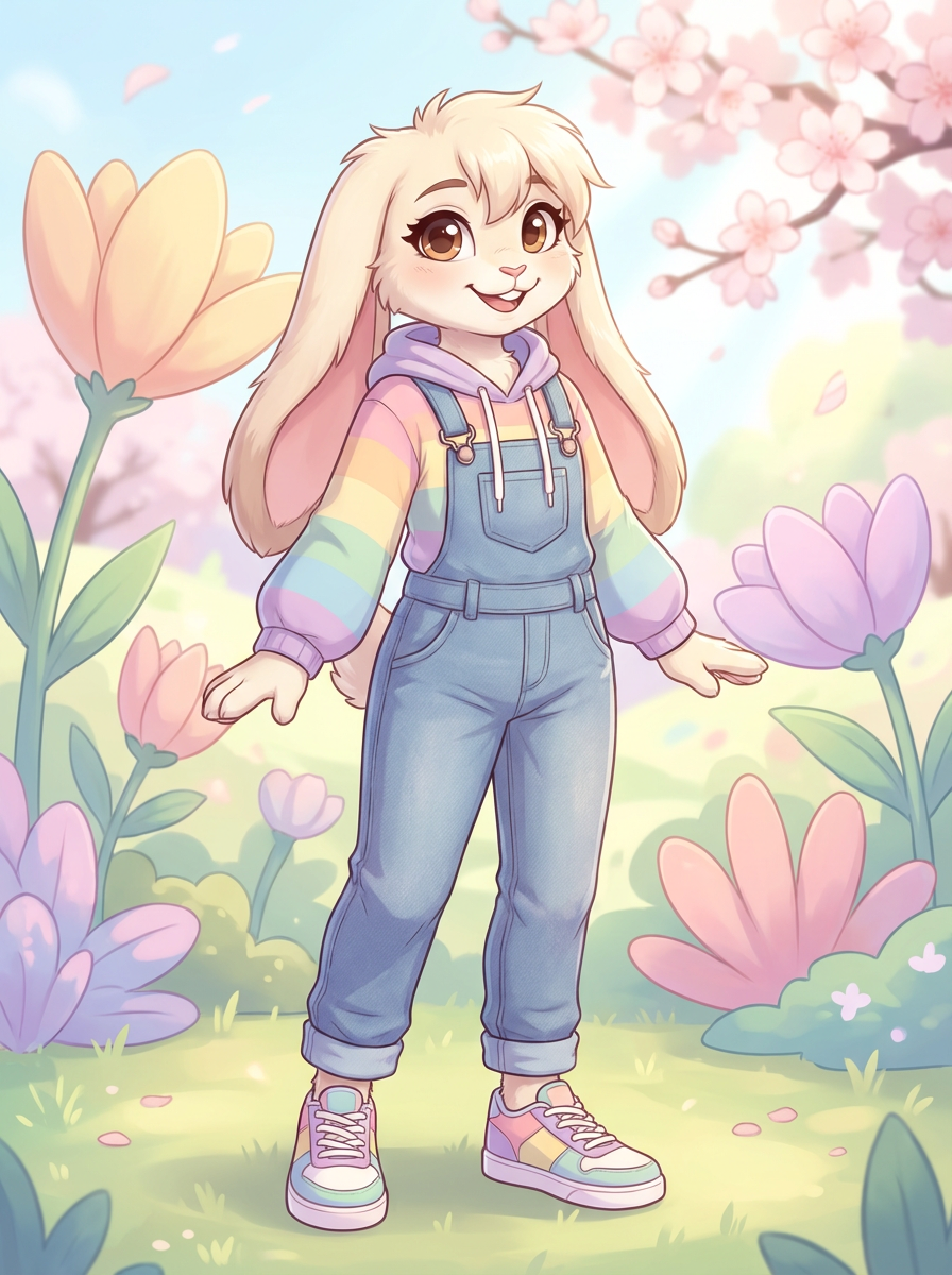 furry character of bunny fursona of model with cute rabbit features, soft fur, and long floppy ears , wearing colorful casual wear, happy expression, detailed digital furry art style, pastel colors