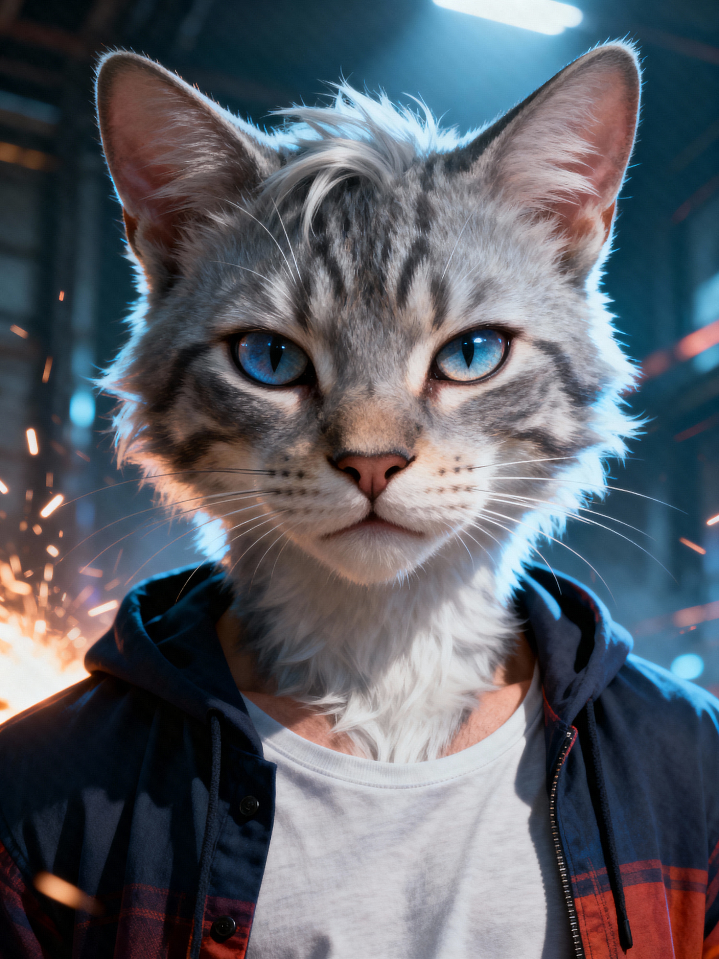 furry character of cat fursona of model with cool feline features, sleek fur, and prominent cat ears, wearing stylish casual outfit, confident expression, detailed digital furry art style, bright colors
