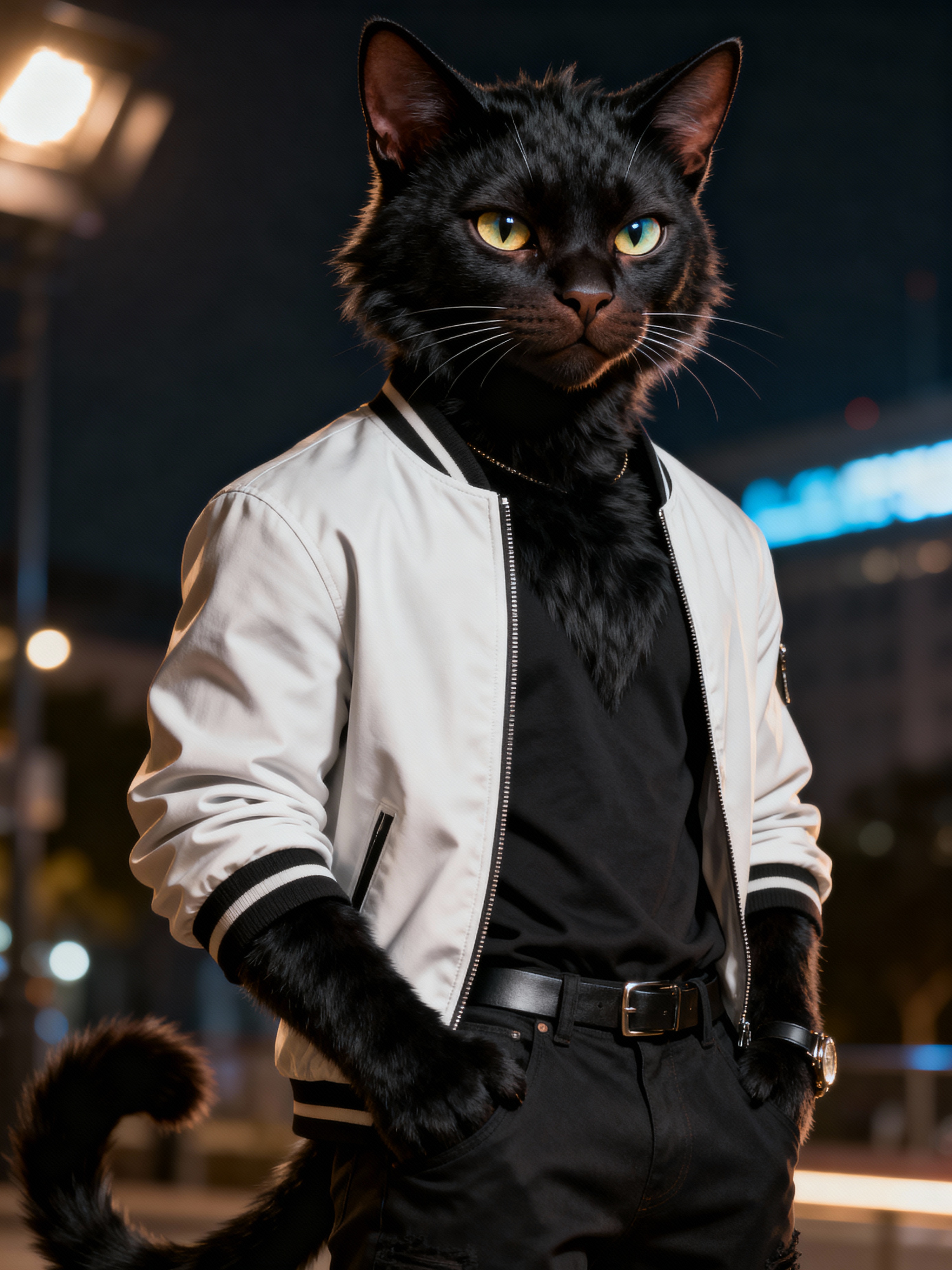 furry character of cat fursona of model with cool feline features, sleek fur, and prominent cat ears, wearing stylish casual outfit, confident expression, detailed digital furry art style, bright colors