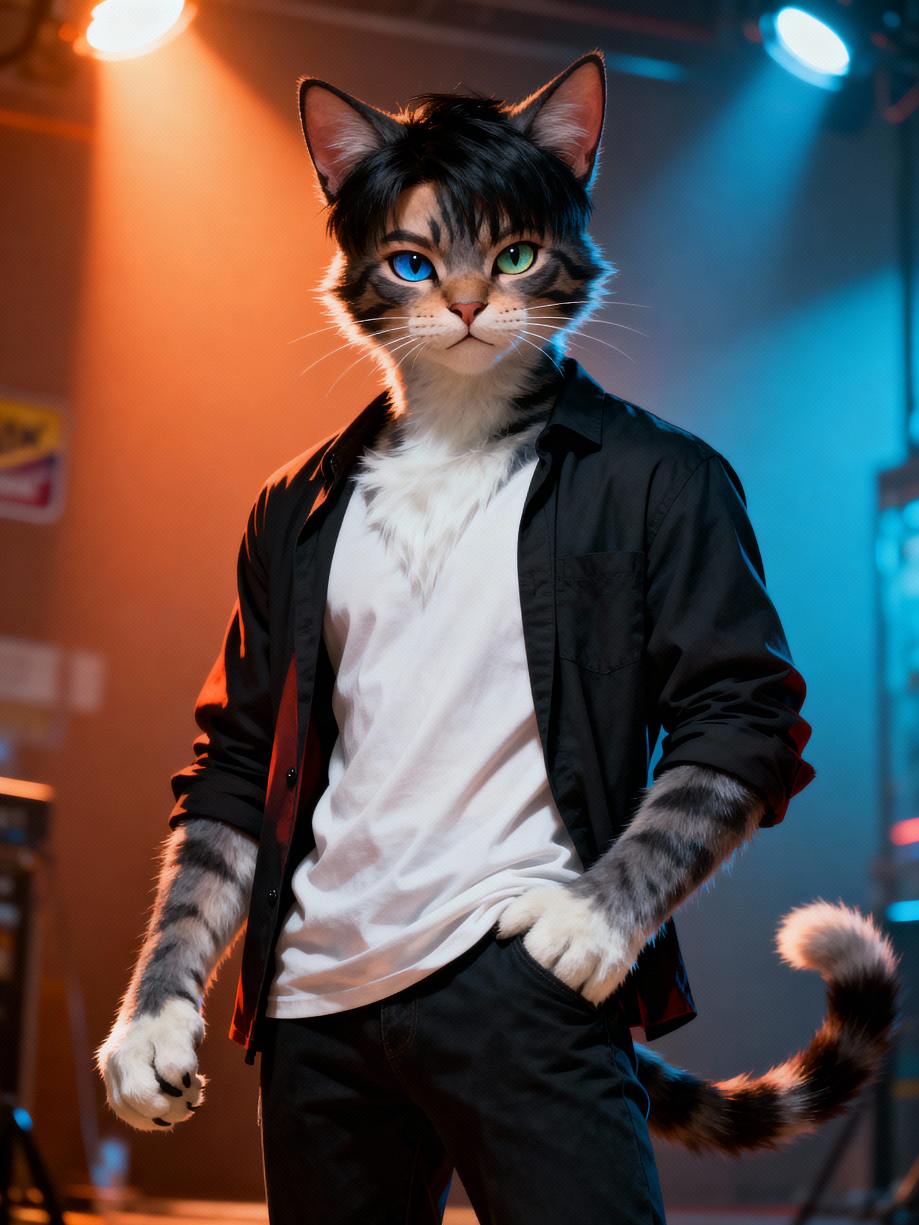 furry character of cat fursona of model with cool feline features, sleek fur, and prominent cat ears, wearing stylish casual outfit, confident expression, detailed digital furry art style, bright colors
