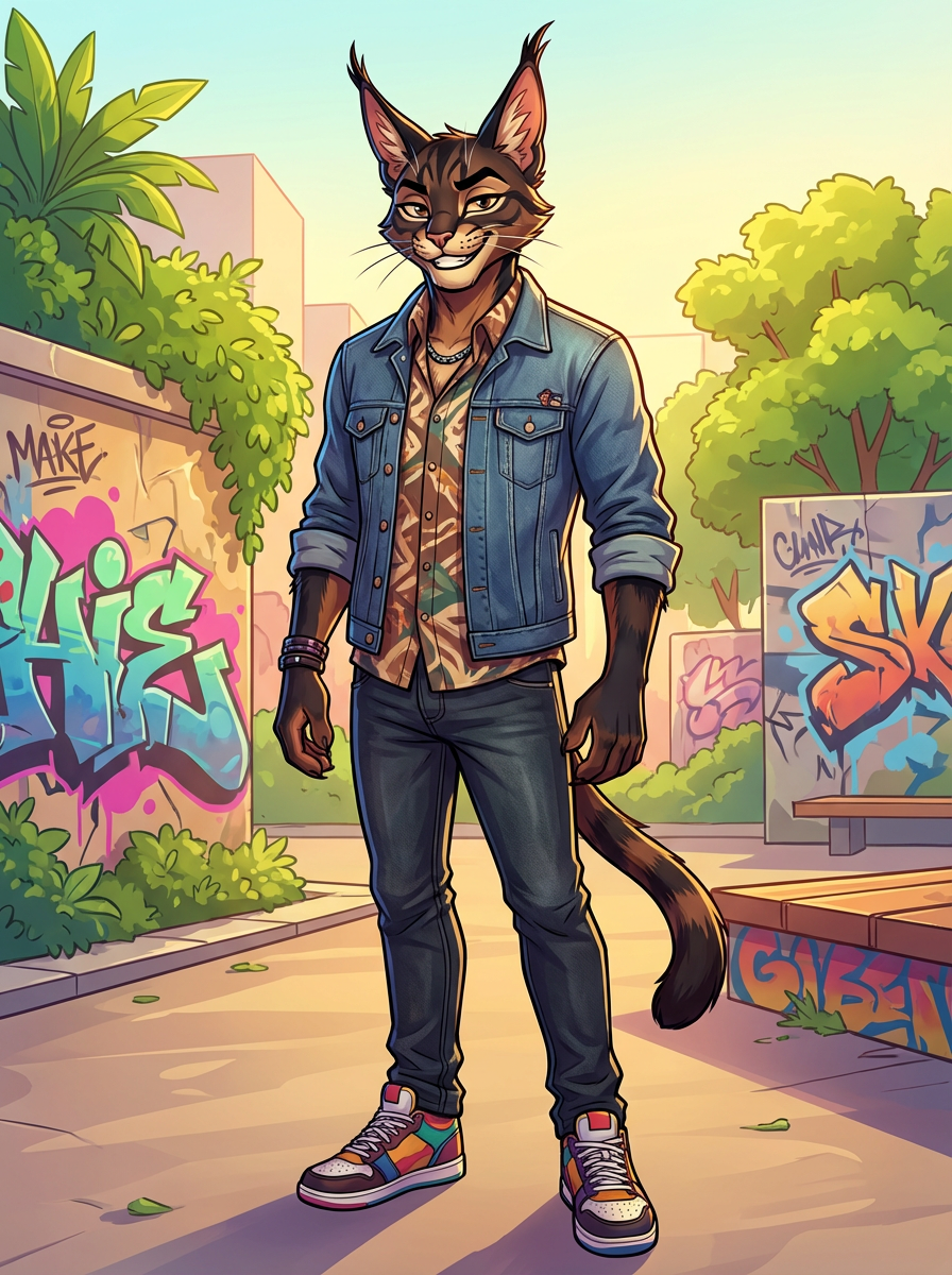 furry character of cat fursona of model with cool feline features, sleek fur, and prominent cat ears, wearing stylish casual outfit, confident expression, detailed digital furry art style, bright colors