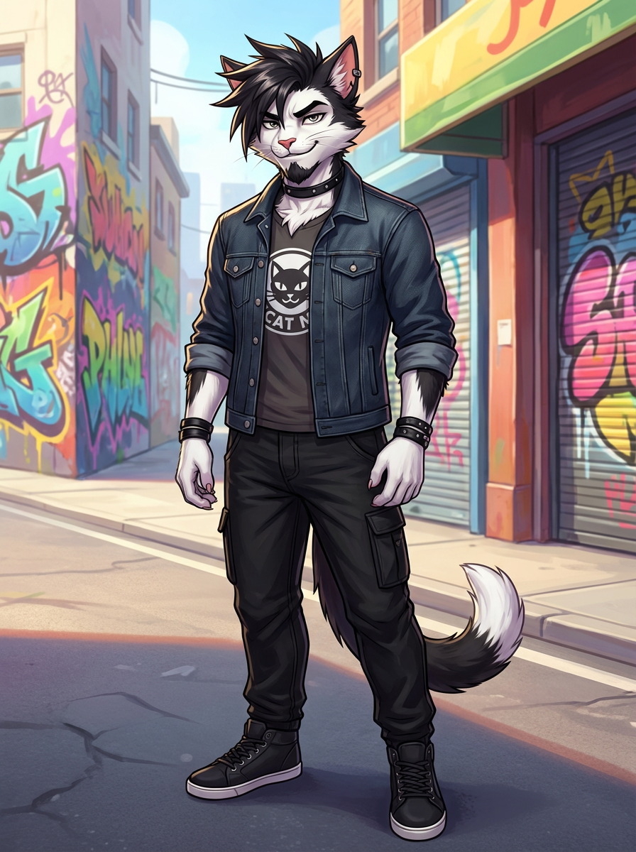 furry character of cat fursona of model with cool feline features, sleek fur, and prominent cat ears, wearing stylish casual outfit, confident expression, detailed digital furry art style, bright colors
