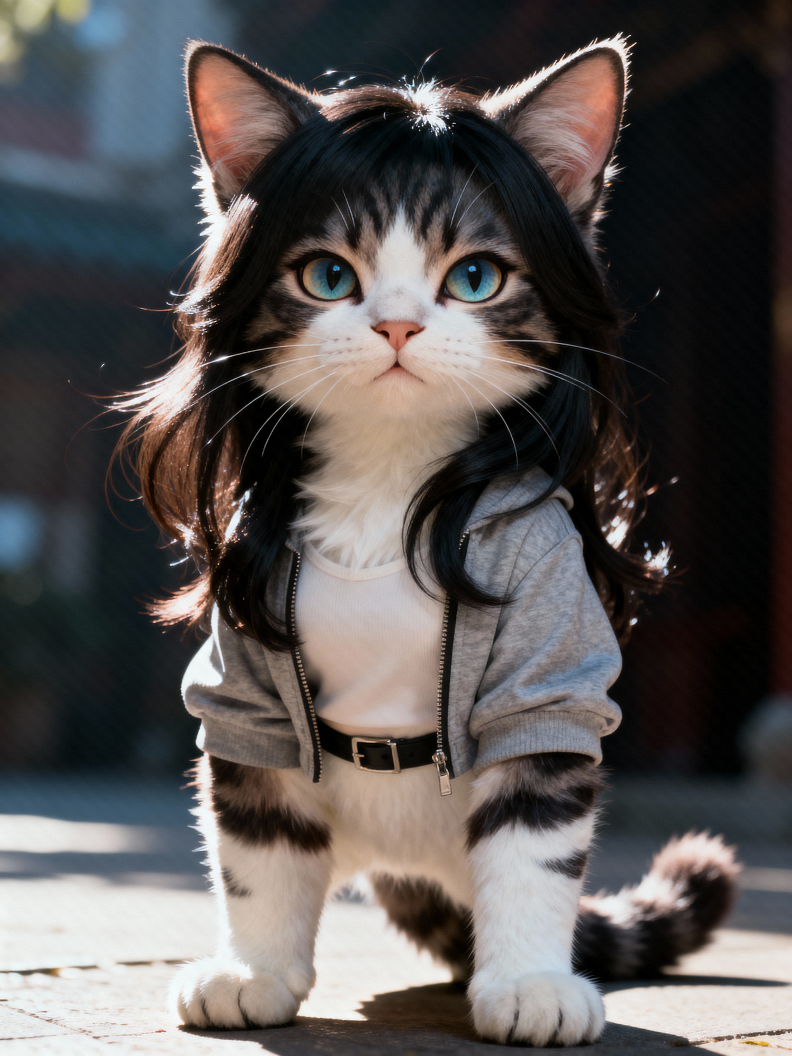 furry character of cat fursona of model with elegant feline features, soft fur, and adorable cat ears , wearing stylish casual outfit, confident expression, detailed digital furry art style, bright colors
