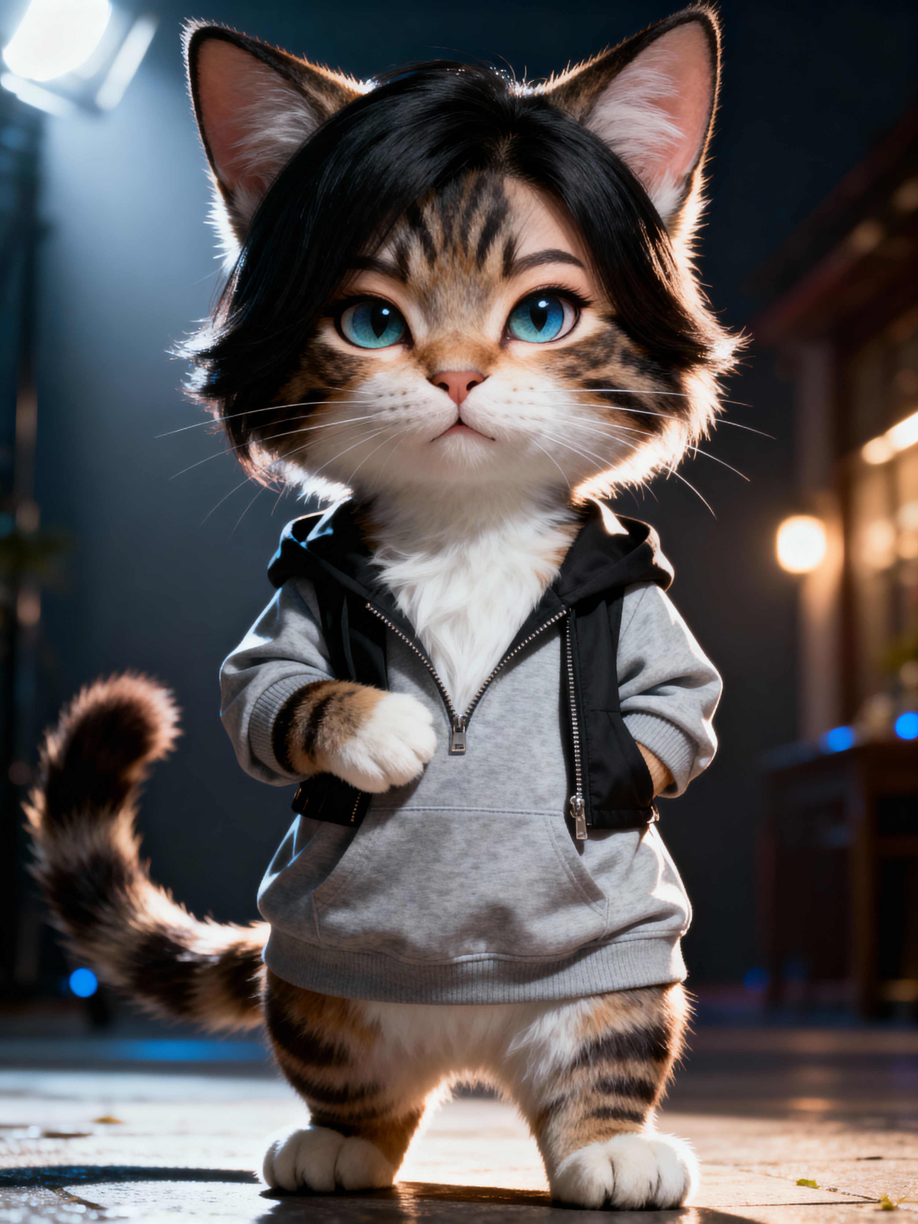 furry character of cat fursona of model with elegant feline features, soft fur, and adorable cat ears , wearing stylish casual outfit, confident expression, detailed digital furry art style, bright colors