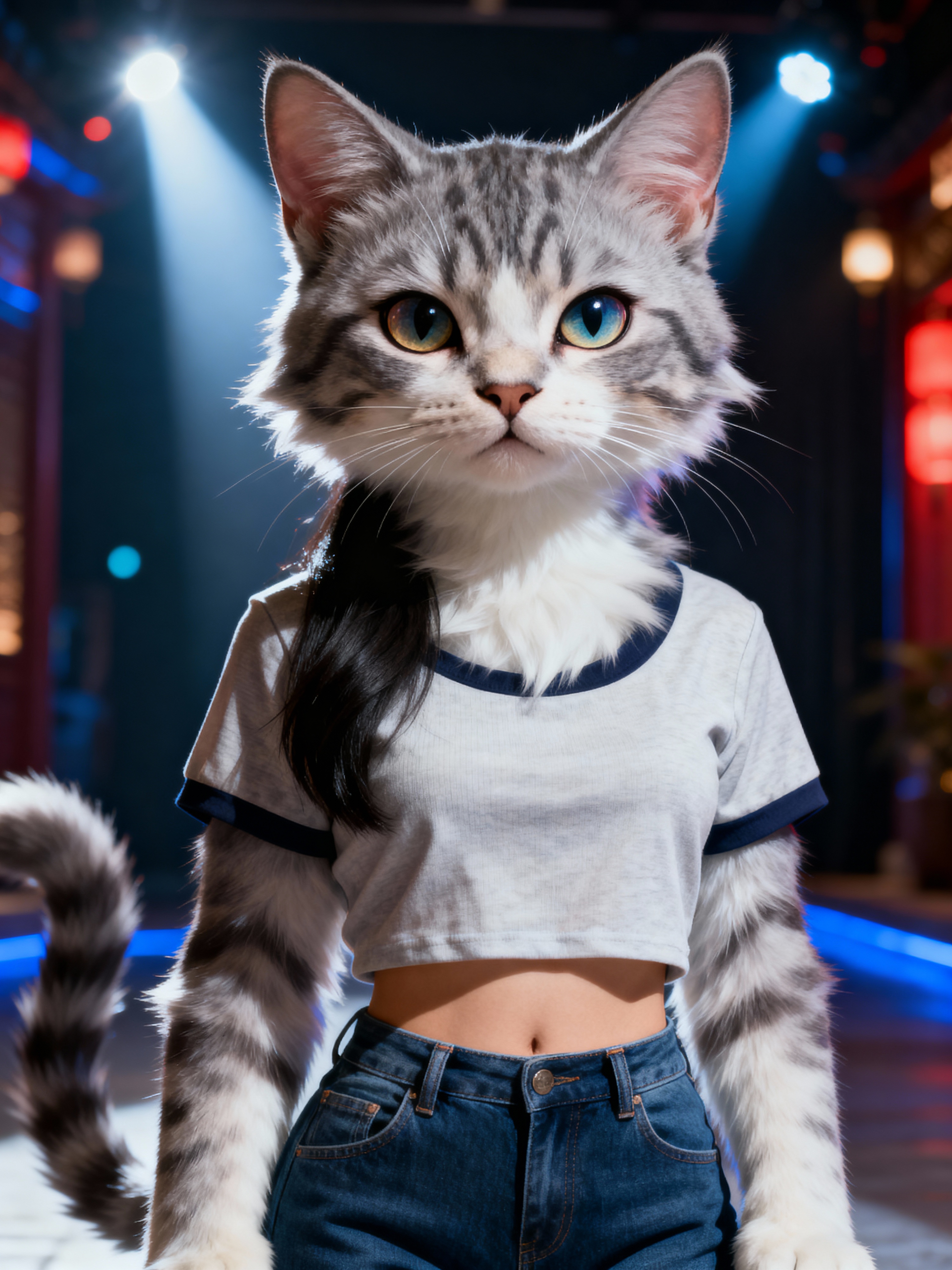 furry character of cat fursona of model with elegant feline features, soft fur, and adorable cat ears , wearing stylish casual outfit, confident expression, detailed digital furry art style, bright colors