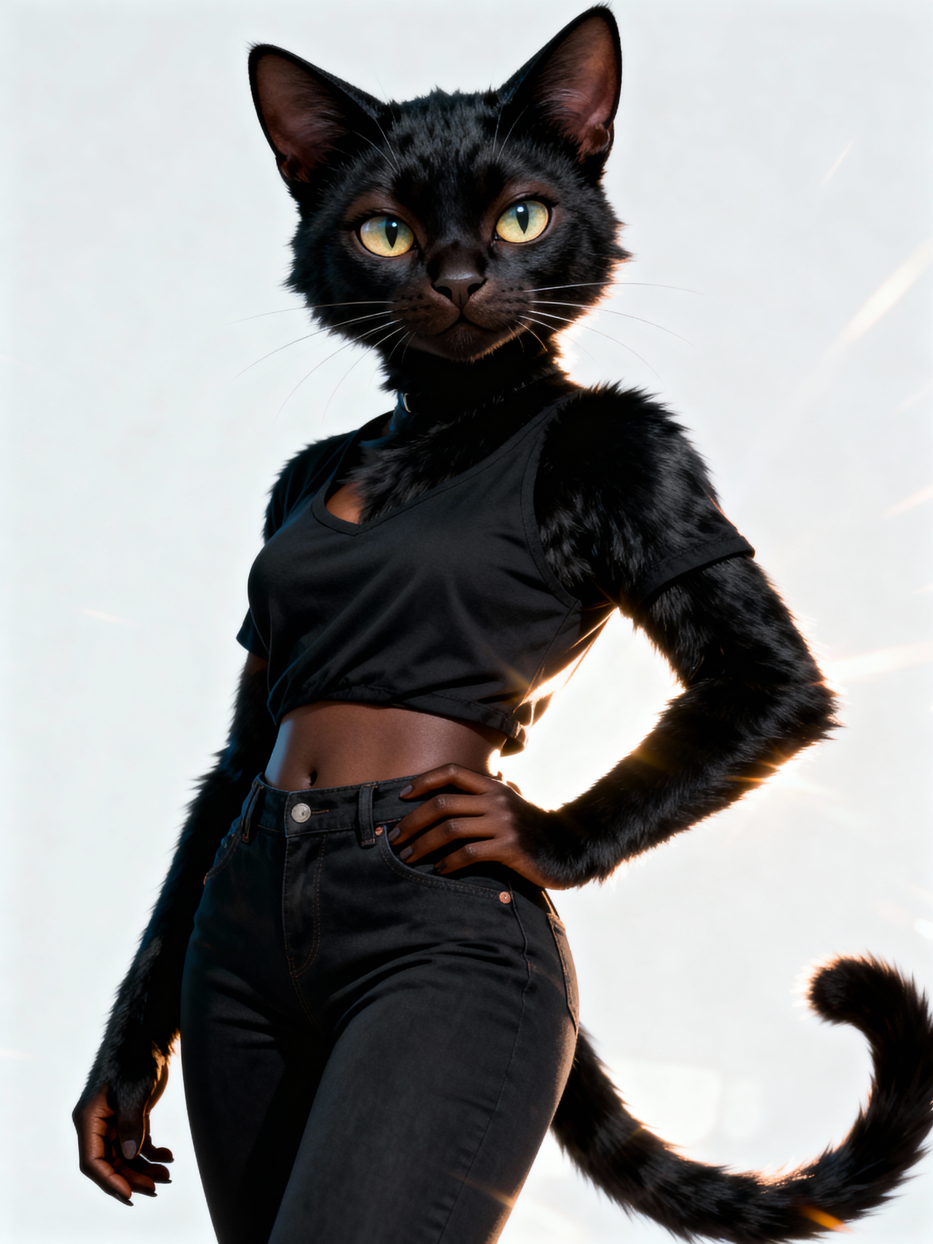 furry character of cat fursona of model with elegant feline features, soft fur, and adorable cat ears , wearing stylish casual outfit, confident expression, detailed digital furry art style, bright colors