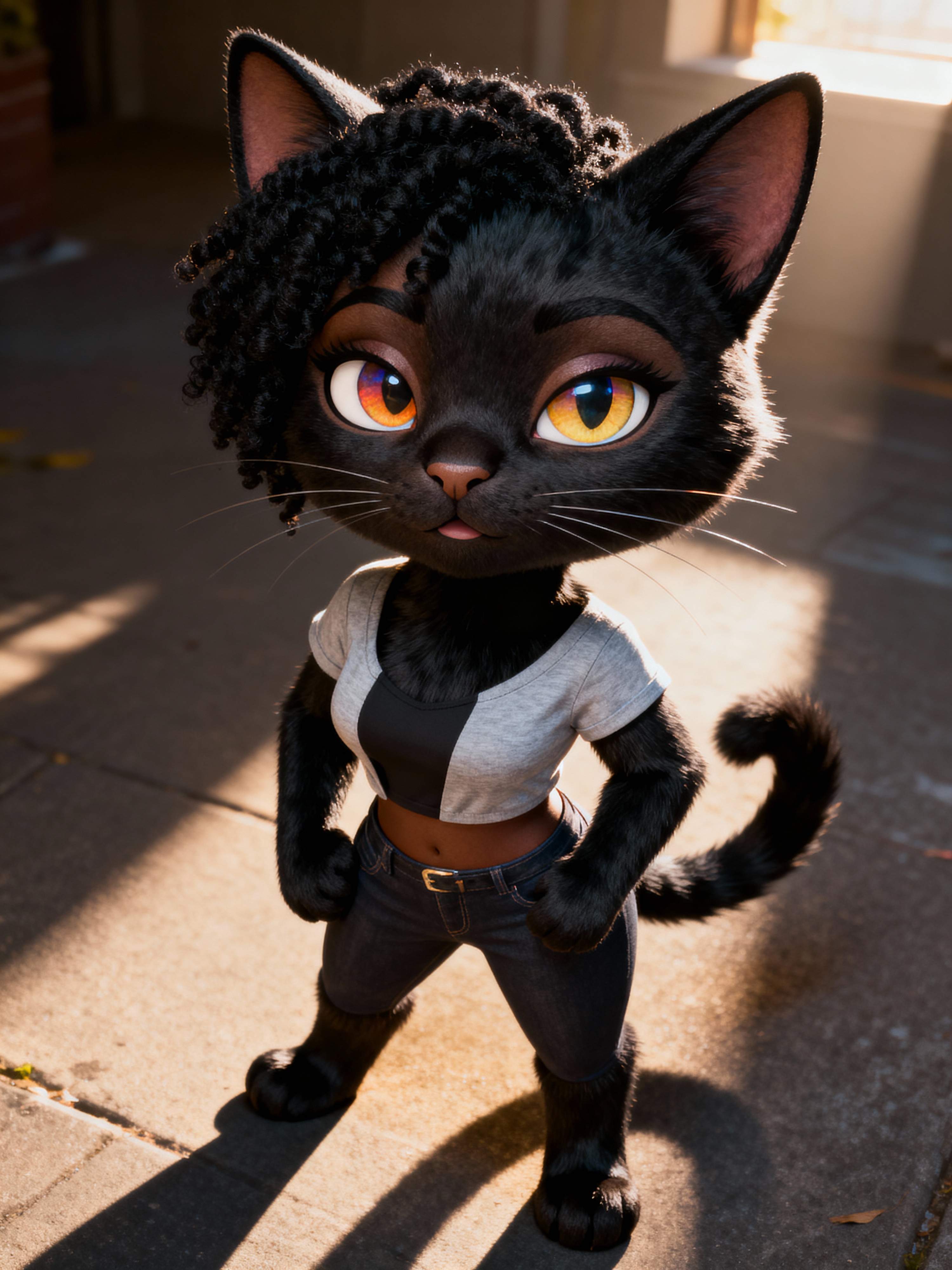 furry character of cat fursona of model with elegant feline features, soft fur, and adorable cat ears , wearing stylish casual outfit, confident expression, detailed digital furry art style, bright colors