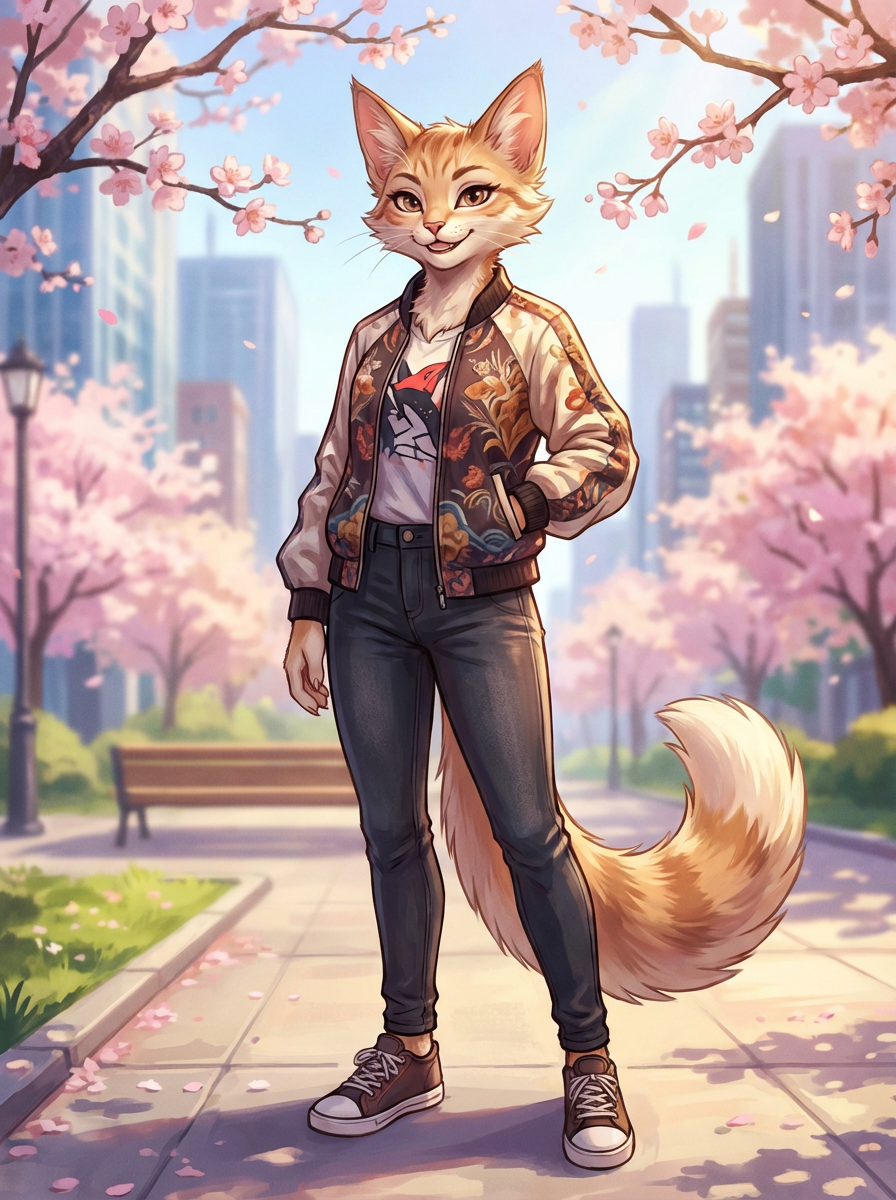 furry character of cat fursona of model with elegant feline features, soft fur, and adorable cat ears , wearing stylish casual outfit, confident expression, detailed digital furry art style, bright colors