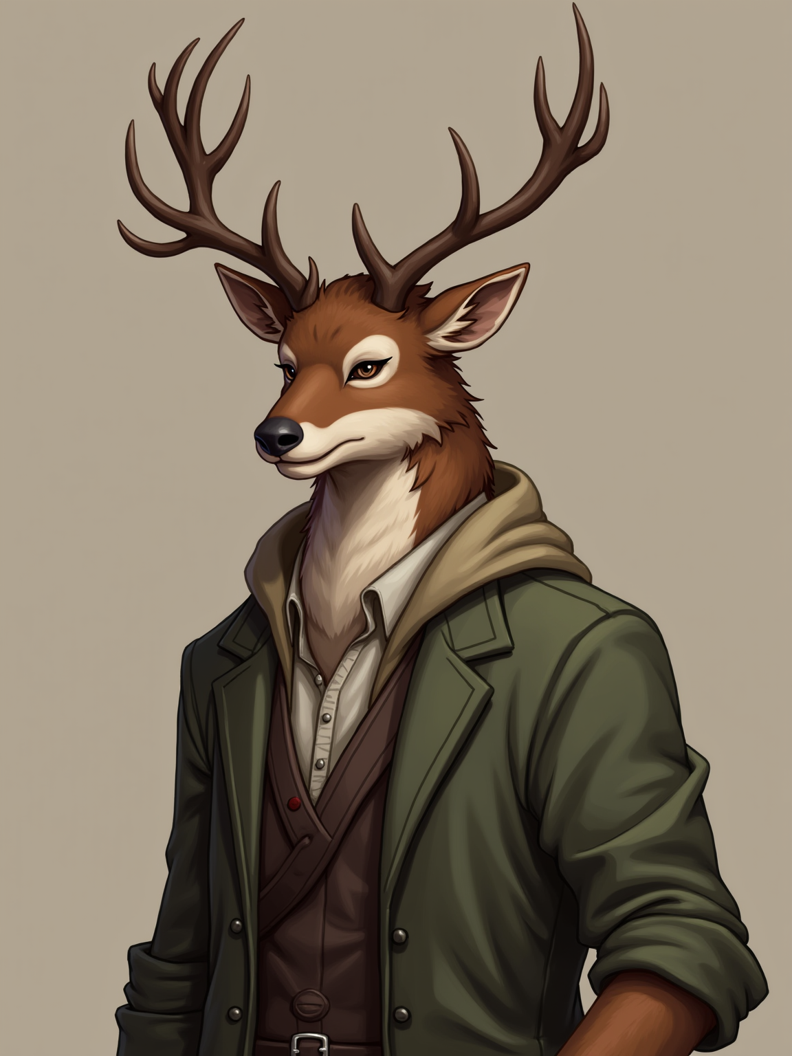 furry character of deer fursona of model with noble stag features with small antlers, brown fur, and strong expression, wearing nature-inspired clothing, serene expression, detailed digital furry art style, earth tones