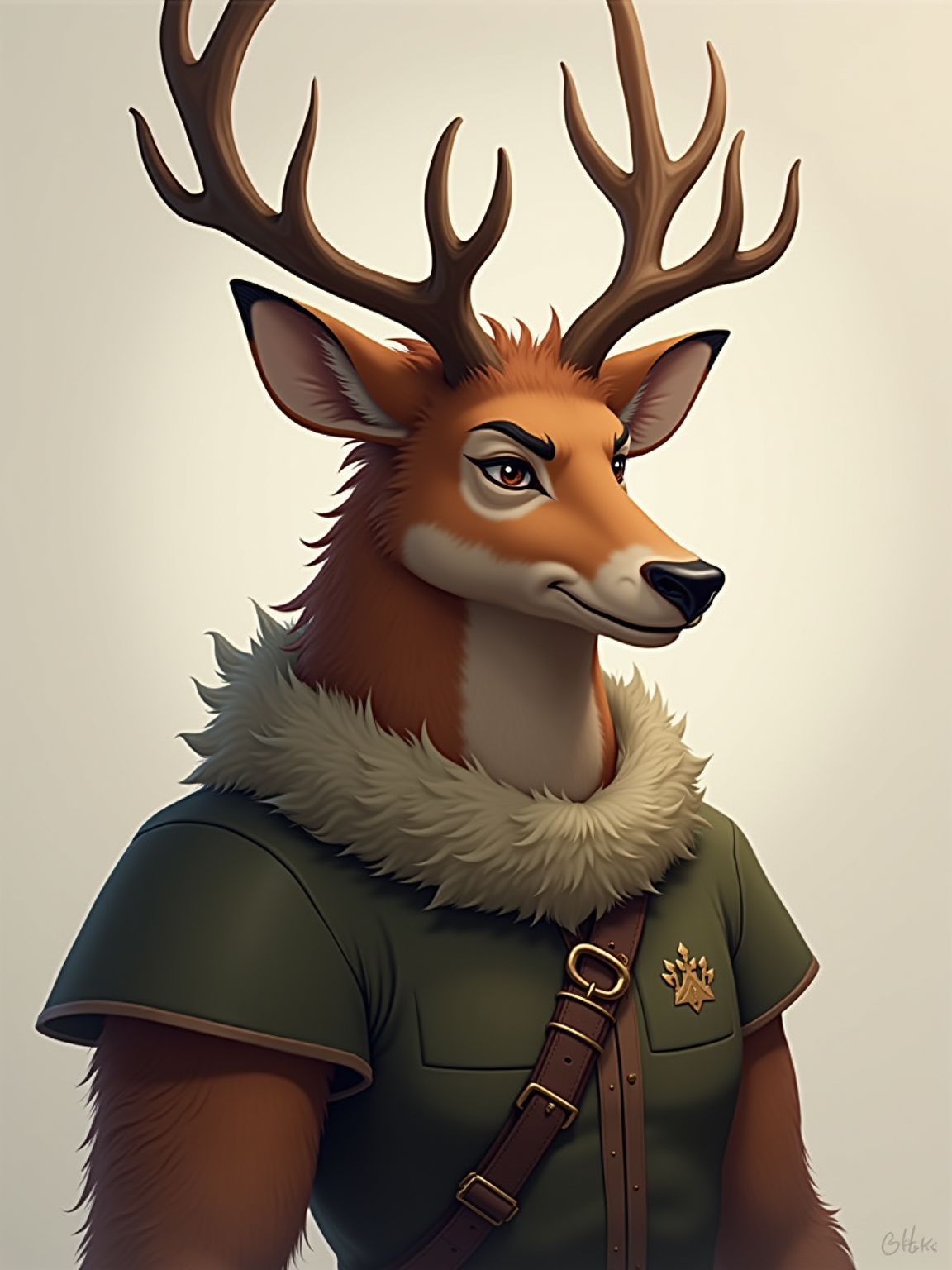 furry character of deer fursona of model with noble stag features with small antlers, brown fur, and strong expression, wearing nature-inspired clothing, serene expression, detailed digital furry art style, earth tones