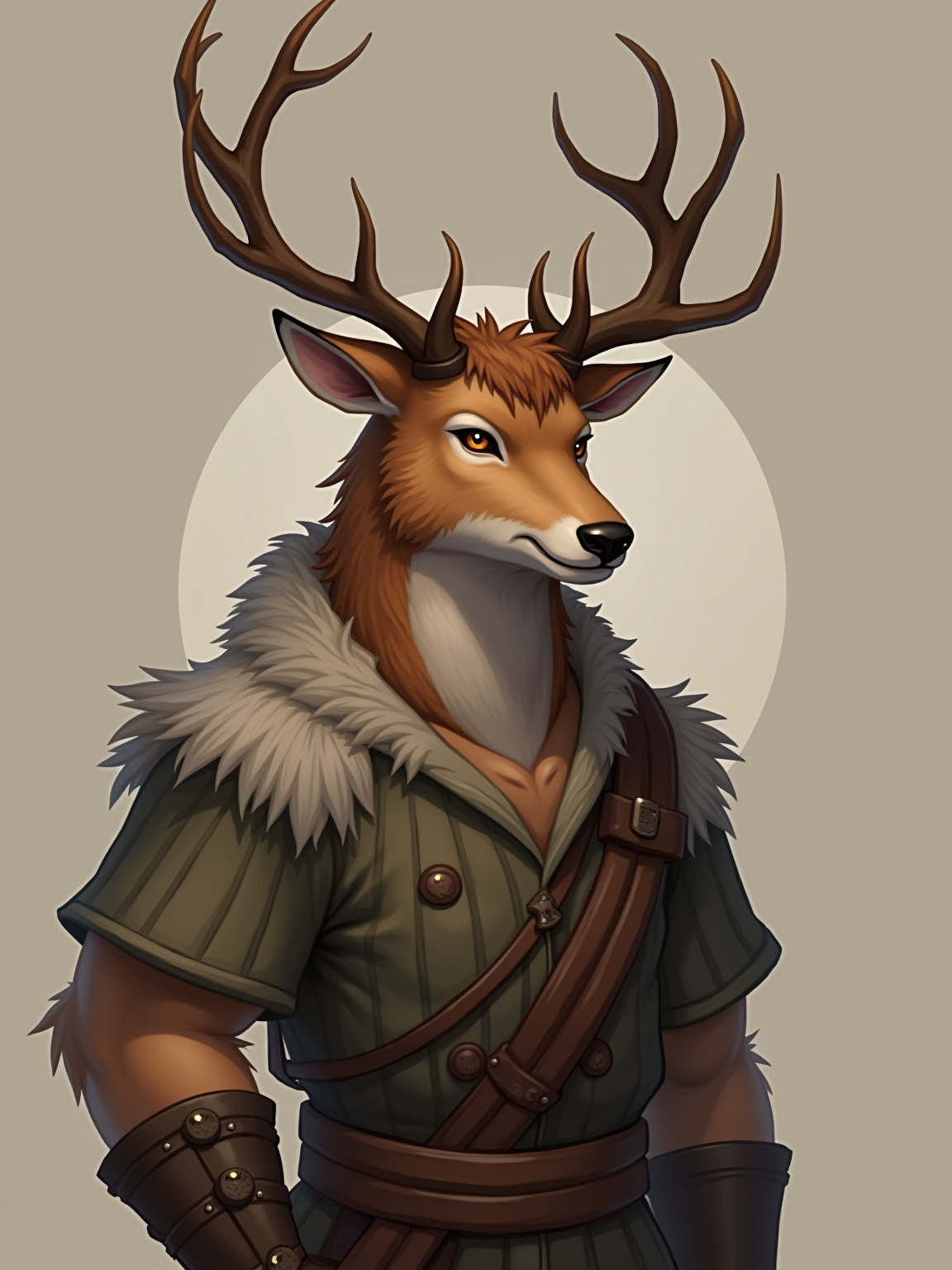 furry character of deer fursona of model with noble stag features with small antlers, brown fur, and strong expression, wearing nature-inspired clothing, serene expression, detailed digital furry art style, earth tones