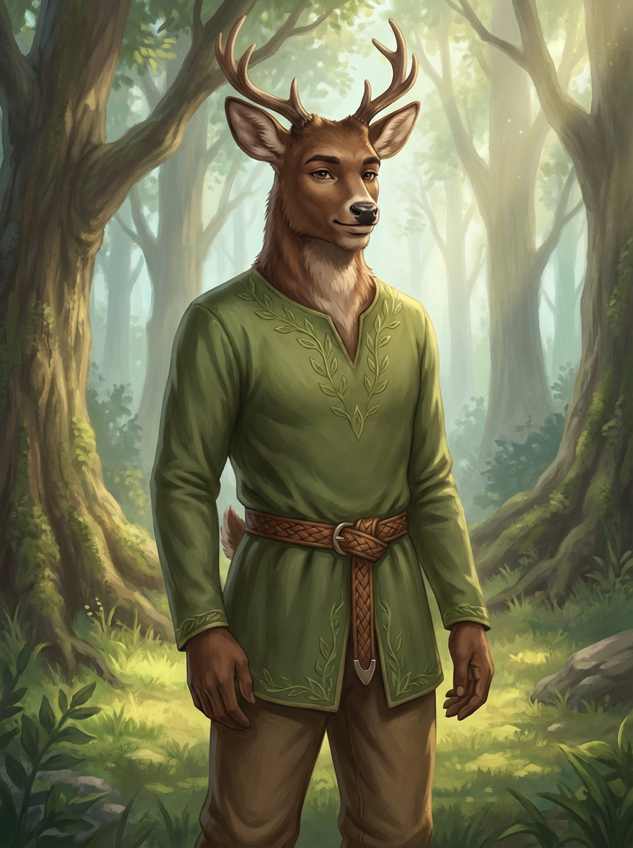 furry character of deer fursona of model with noble stag features with small antlers, brown fur, and strong expression, wearing nature-inspired clothing, serene expression, detailed digital furry art style, earth tones