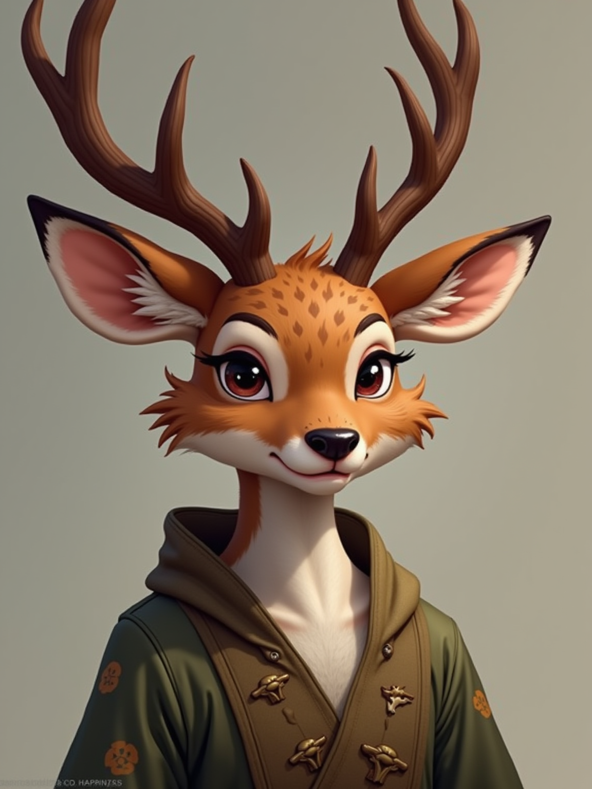 furry character of deer fursona of model with graceful doe features, brown spotted fur, and gentle expression , wearing nature-inspired clothing, serene expression, detailed digital furry art style, earth tones