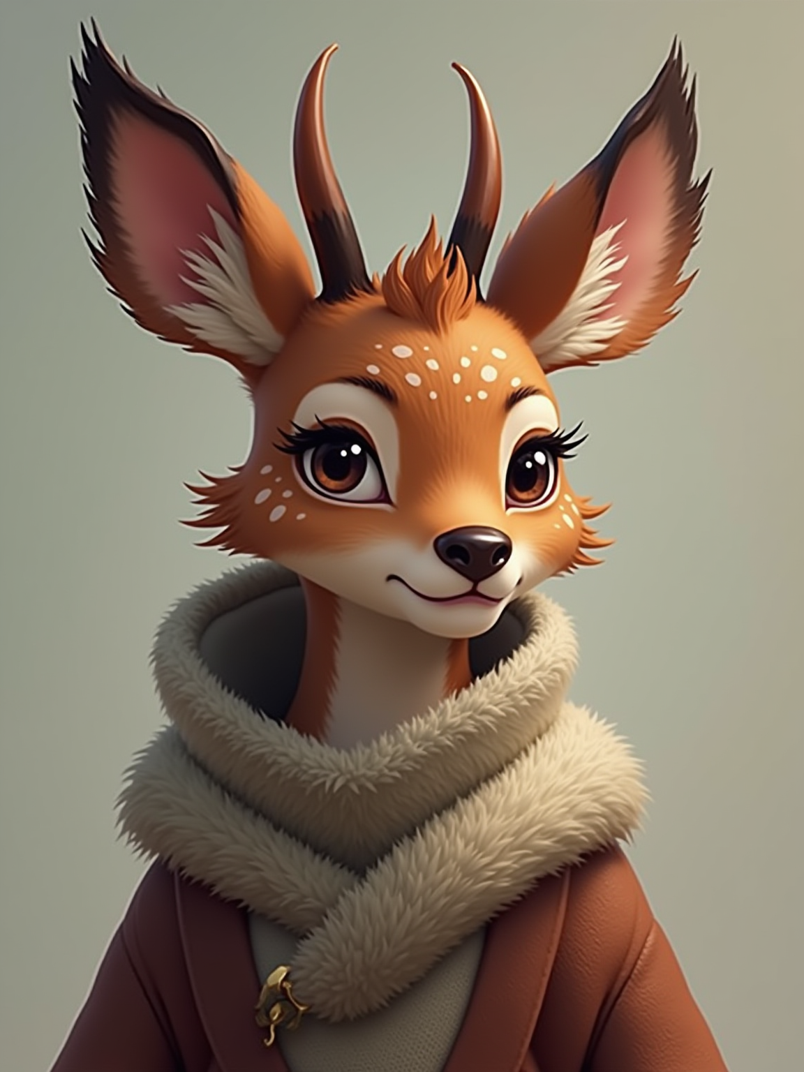 furry character of deer fursona of model with graceful doe features, brown spotted fur, and gentle expression , wearing nature-inspired clothing, serene expression, detailed digital furry art style, earth tones