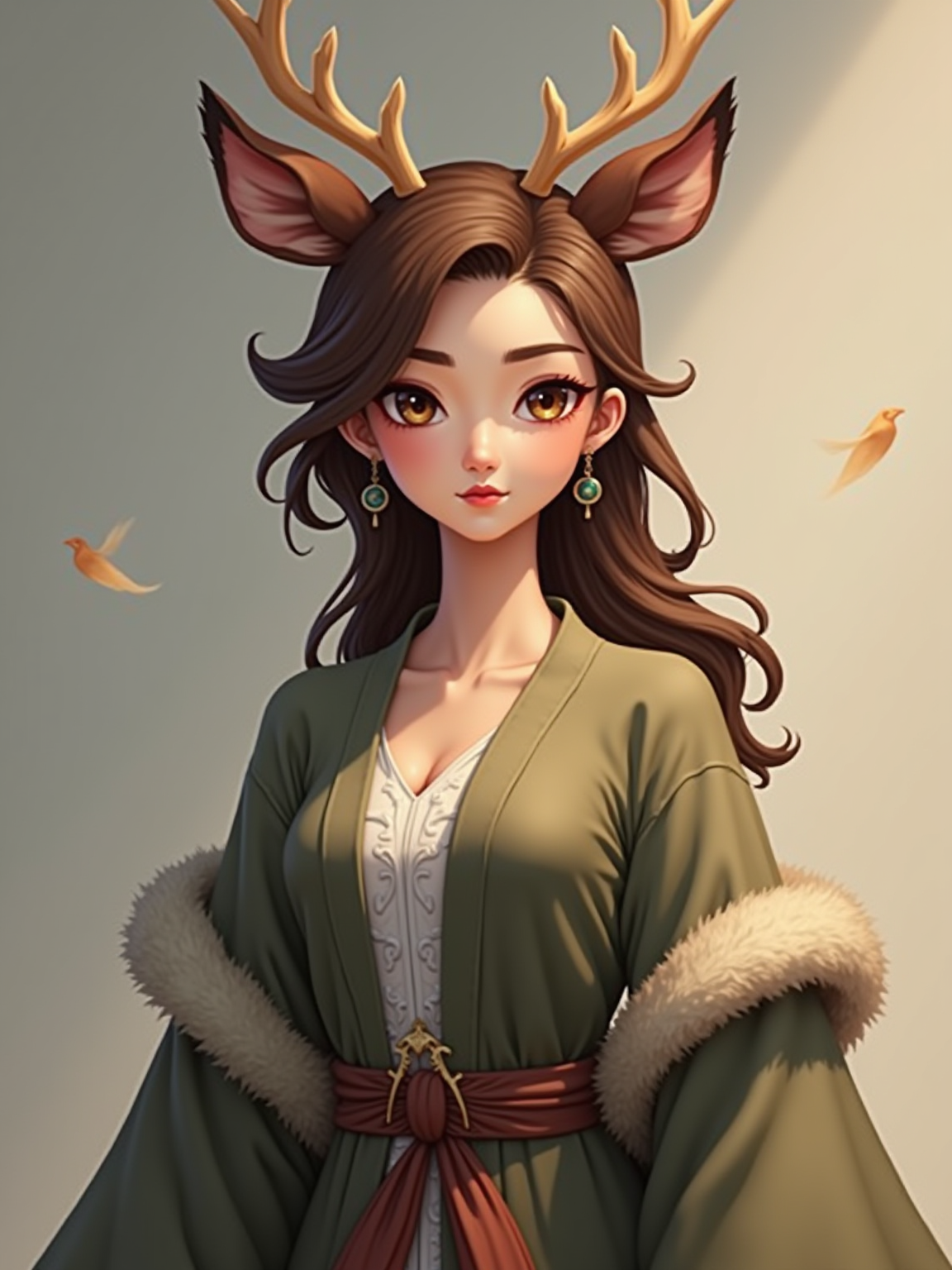 furry character of deer fursona of model with graceful doe features, brown spotted fur, and gentle expression , wearing nature-inspired clothing, serene expression, detailed digital furry art style, earth tones