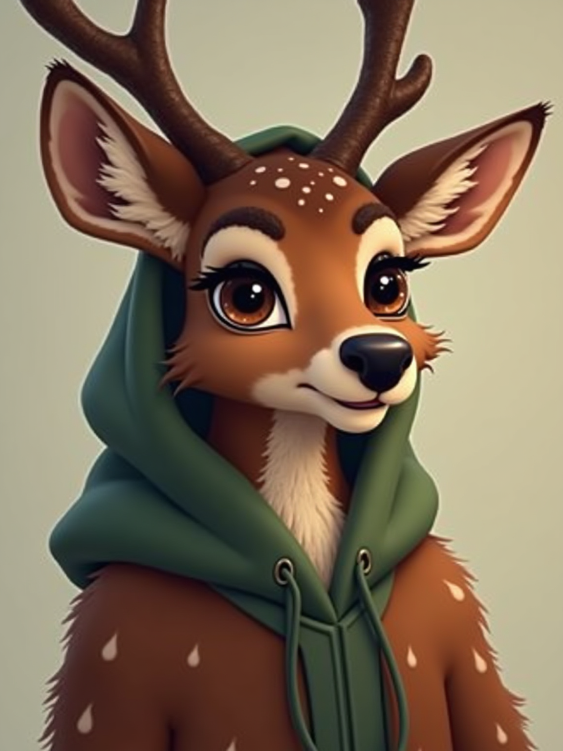 furry character of deer fursona of model with graceful doe features, brown spotted fur, and gentle expression , wearing nature-inspired clothing, serene expression, detailed digital furry art style, earth tones