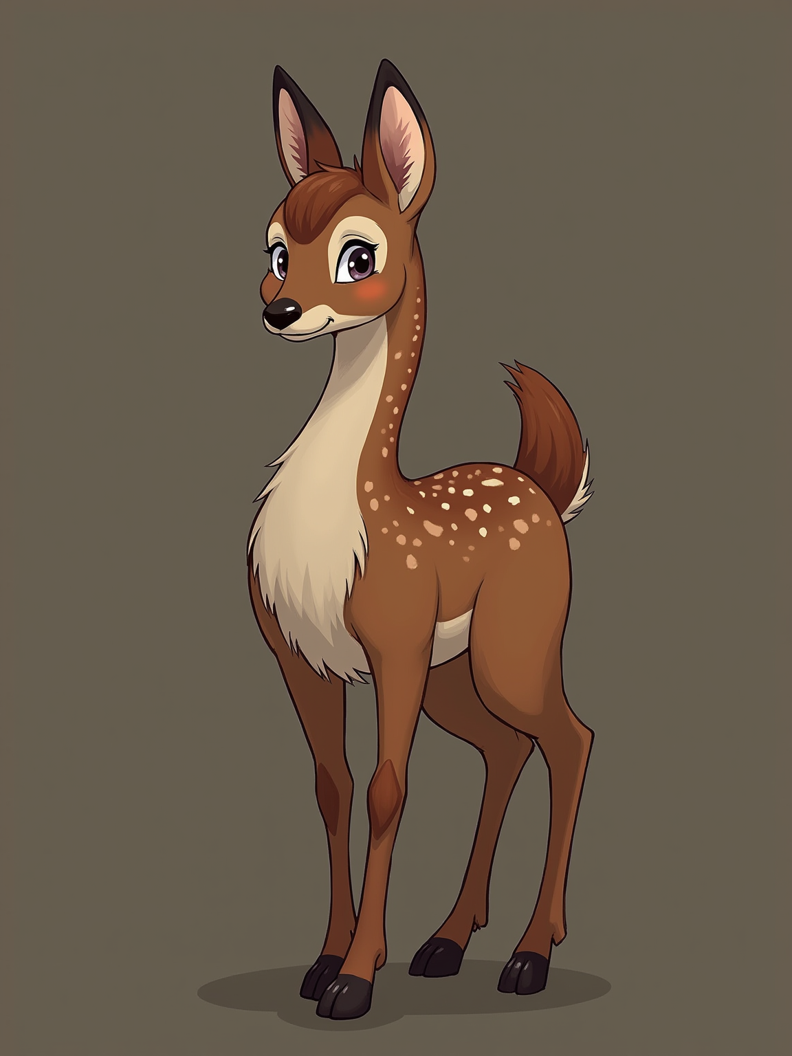 furry character of deer fursona of model with graceful doe features, brown spotted fur, and gentle expression , wearing nature-inspired clothing, serene expression, detailed digital furry art style, earth tones