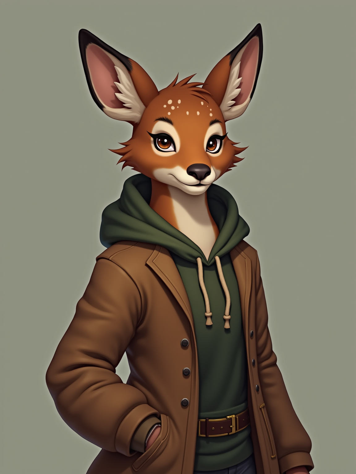 furry character of deer fursona of model with graceful doe features, brown spotted fur, and gentle expression , wearing nature-inspired clothing, serene expression, detailed digital furry art style, earth tones