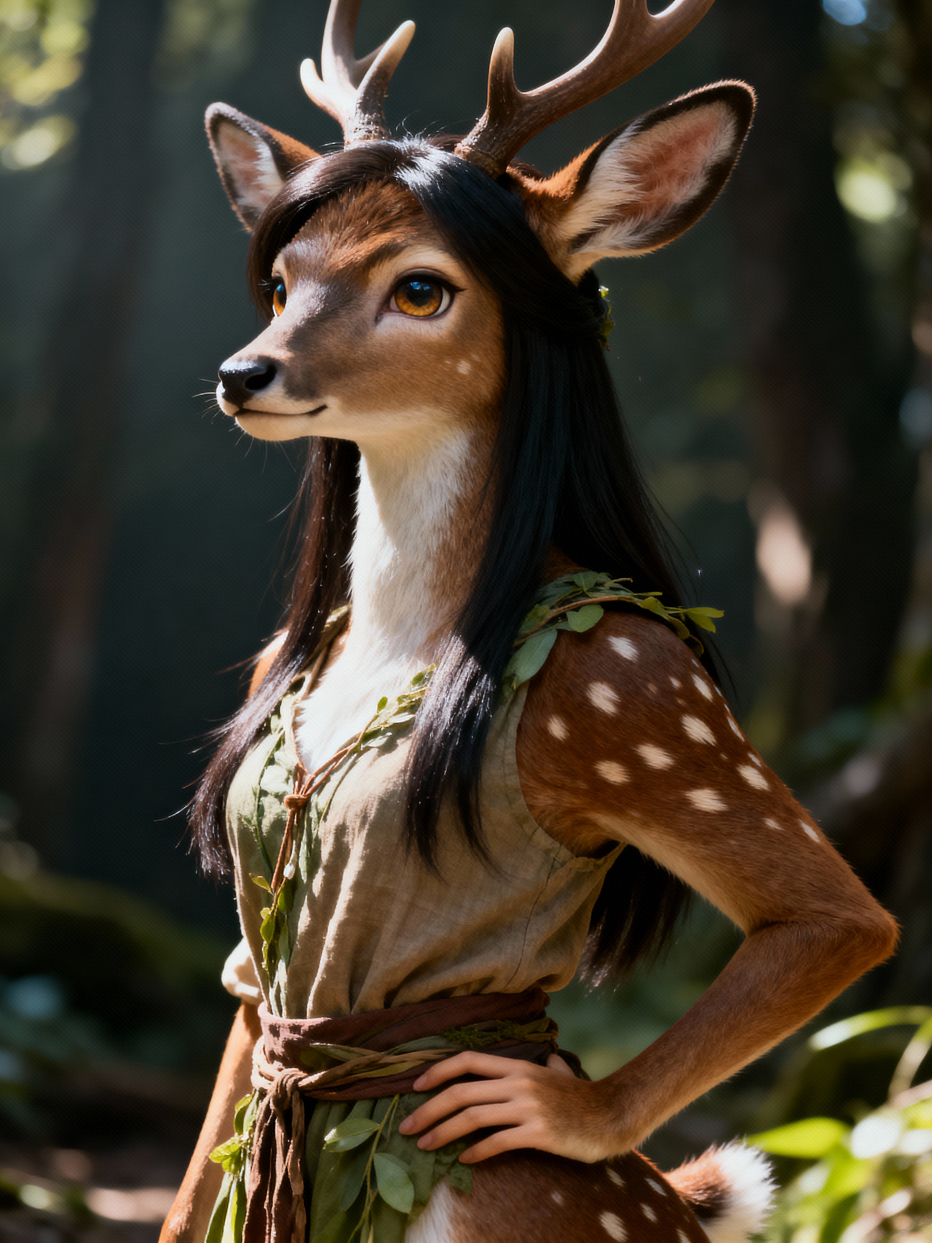 furry character of deer fursona of model with graceful doe features, brown spotted fur, and gentle expression , wearing nature-inspired clothing, serene expression, detailed digital furry art style, earth tones