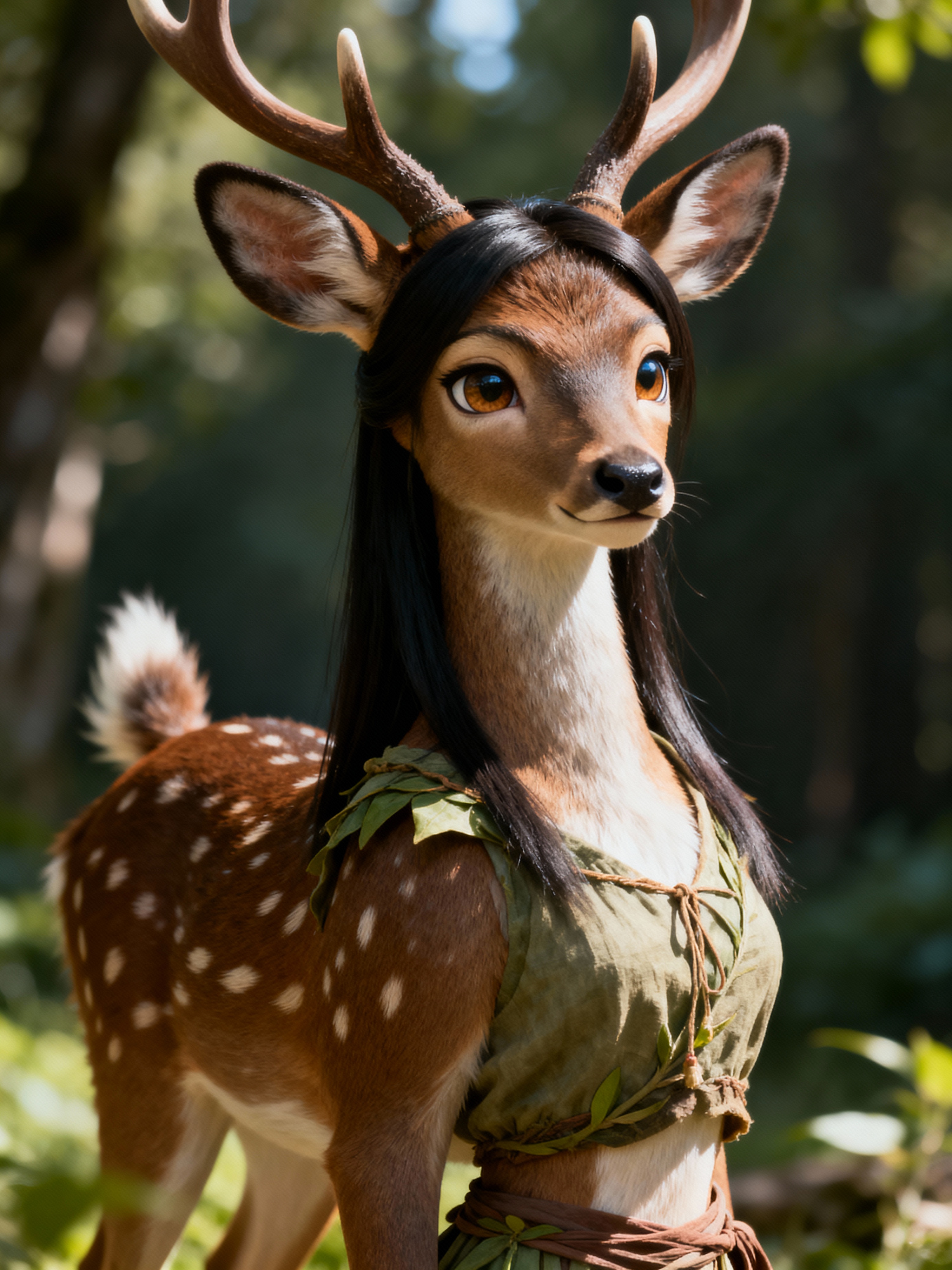 furry character of deer fursona of model with graceful doe features, brown spotted fur, and gentle expression , wearing nature-inspired clothing, serene expression, detailed digital furry art style, earth tones