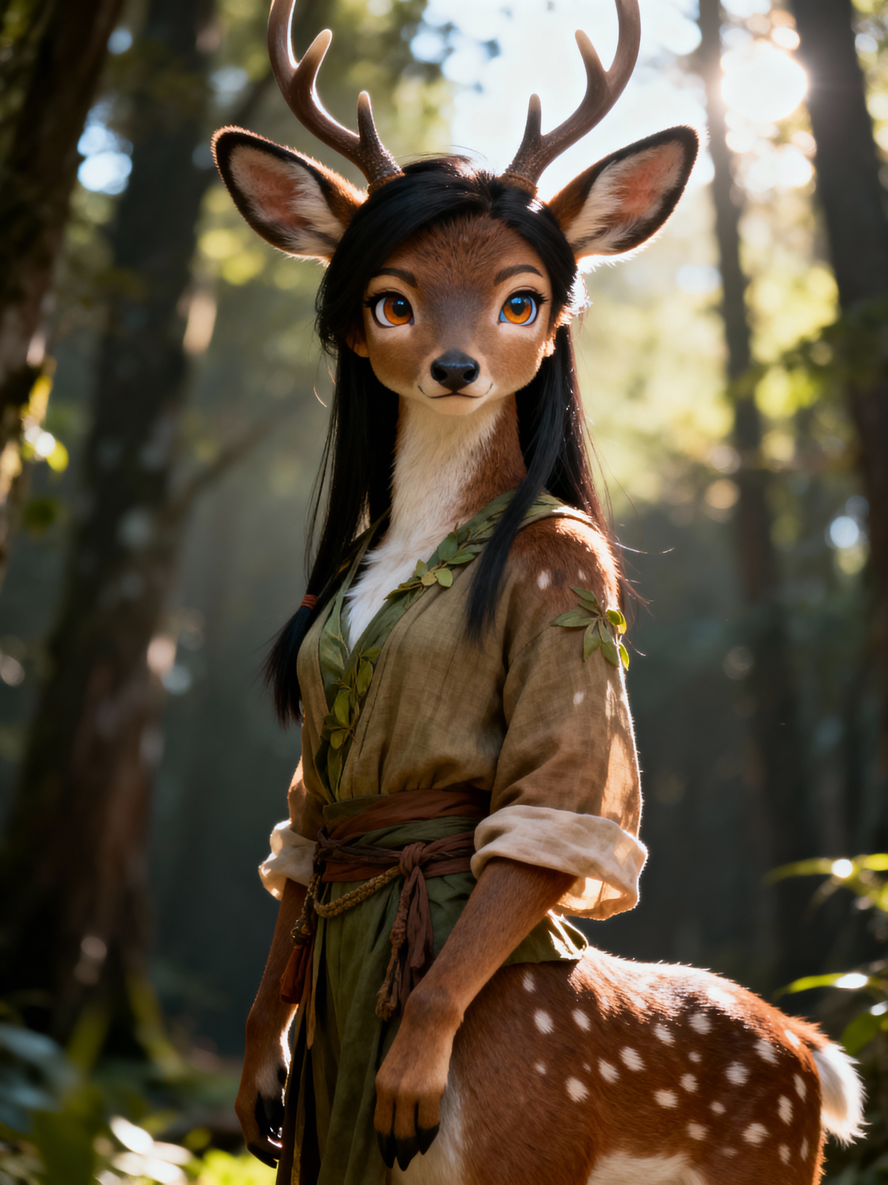 furry character of deer fursona of model with graceful doe features, brown spotted fur, and gentle expression , wearing nature-inspired clothing, serene expression, detailed digital furry art style, earth tones
