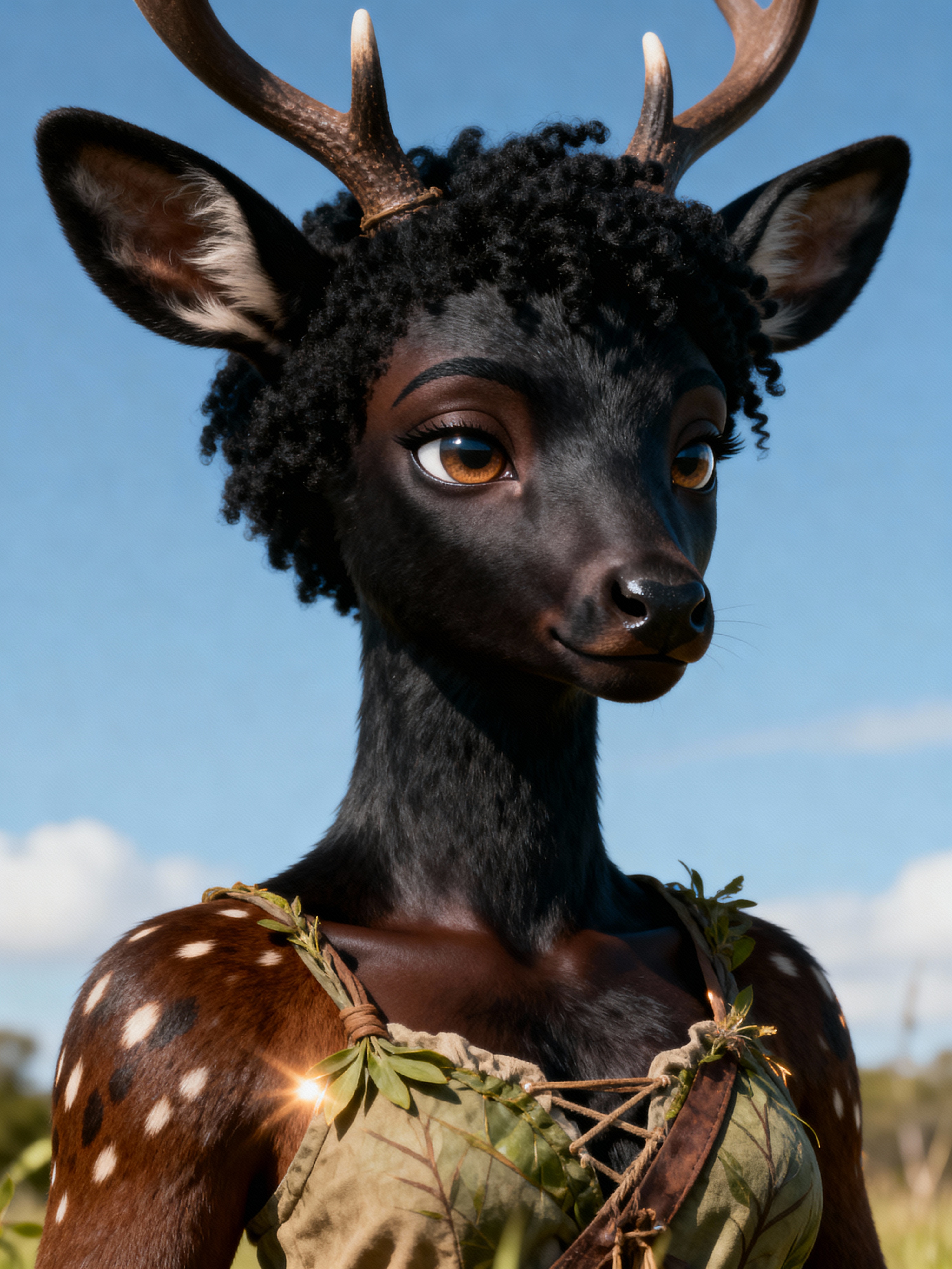 furry character of deer fursona of model with graceful doe features, brown spotted fur, and gentle expression , wearing nature-inspired clothing, serene expression, detailed digital furry art style, earth tones