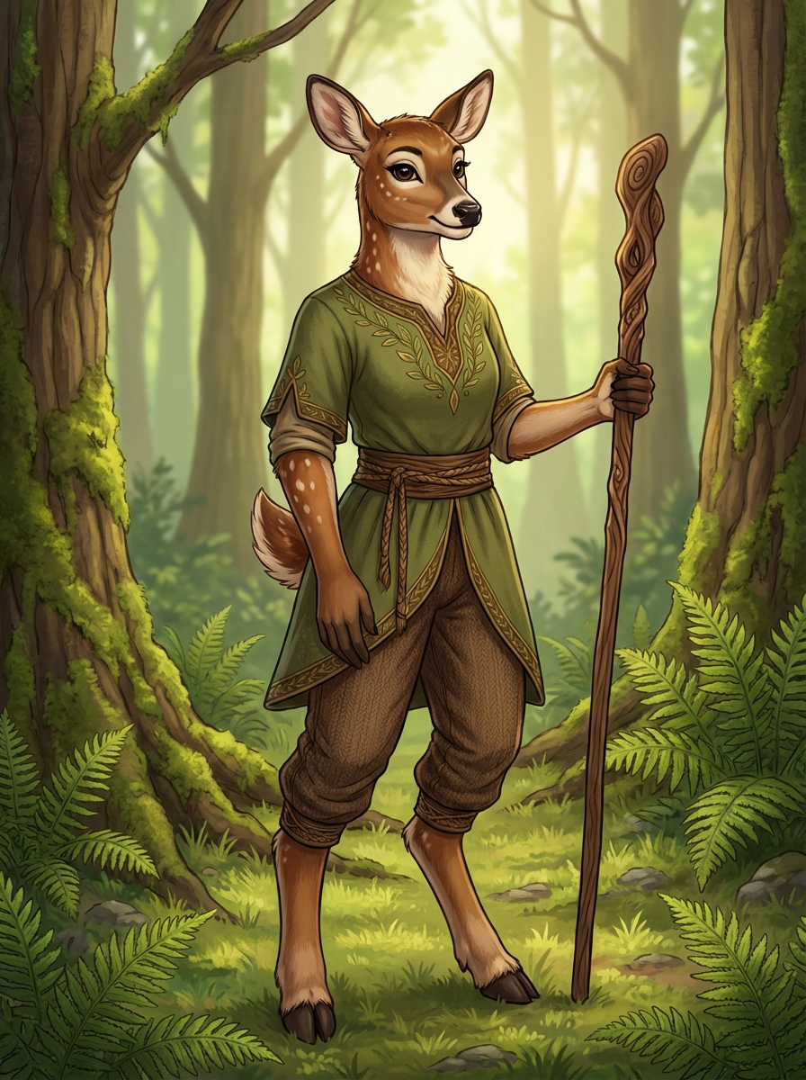 furry character of deer fursona of model with graceful doe features, brown spotted fur, and gentle expression , wearing nature-inspired clothing, serene expression, detailed digital furry art style, earth tones