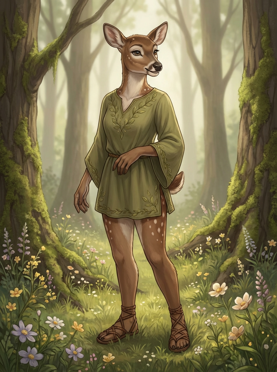 furry character of deer fursona of model with graceful doe features, brown spotted fur, and gentle expression , wearing nature-inspired clothing, serene expression, detailed digital furry art style, earth tones