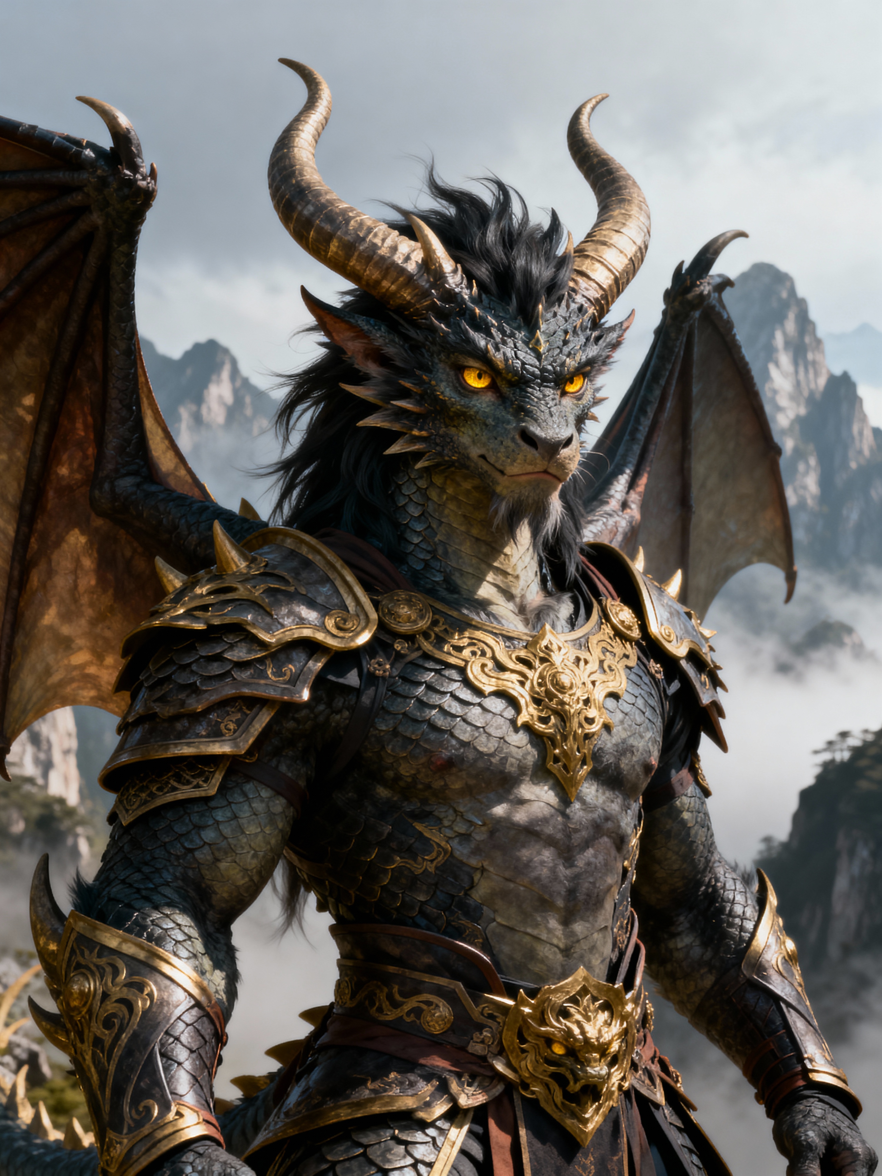 furry character of dragon fursona of model with powerful dragon features, scaled skin, prominent horns, and large wings, wearing fantasy-inspired clothing, majestic expression, detailed digital furry art style