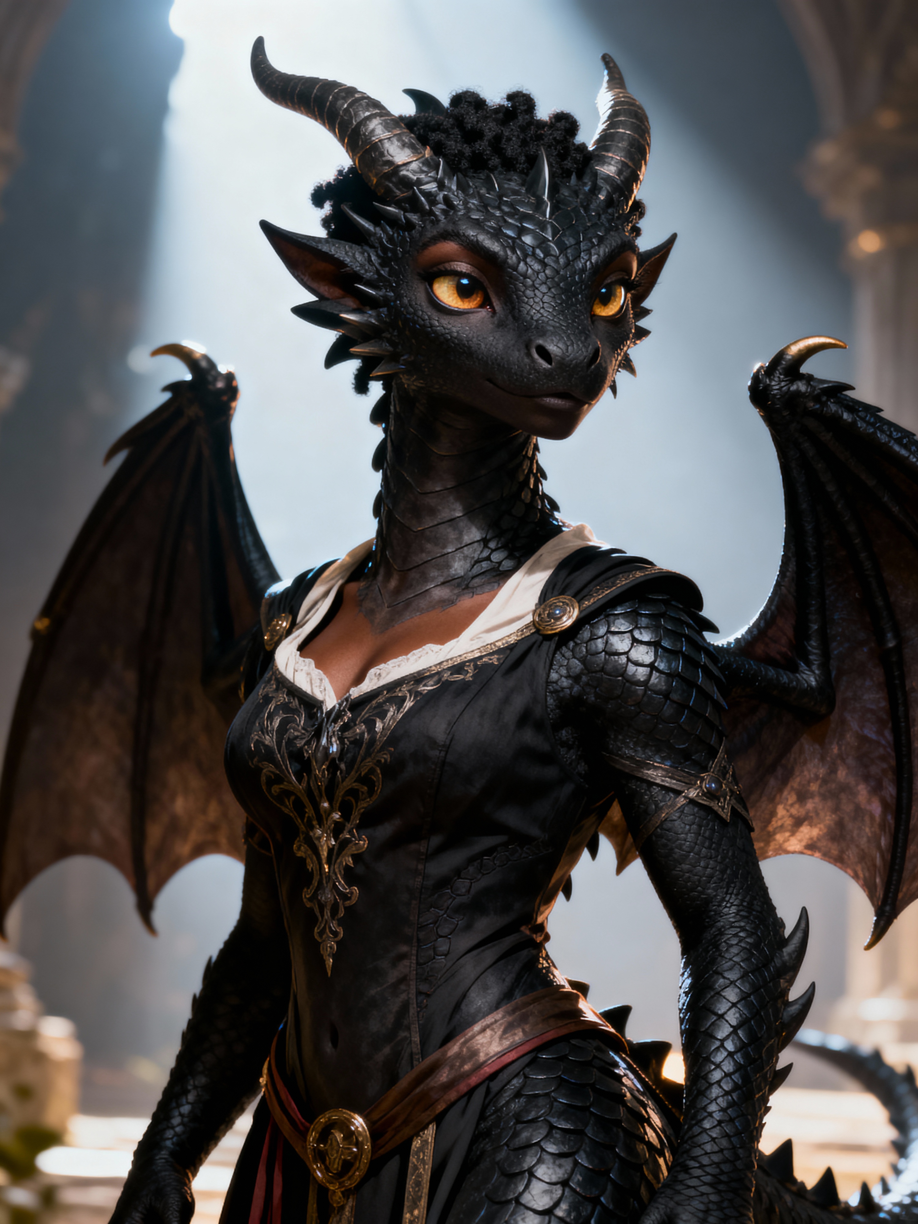 furry character of dragon fursona of model with graceful dragon features, scaled skin, small horns, and elegant wings , wearing fantasy-inspired clothing, majestic expression, detailed digital furry art style