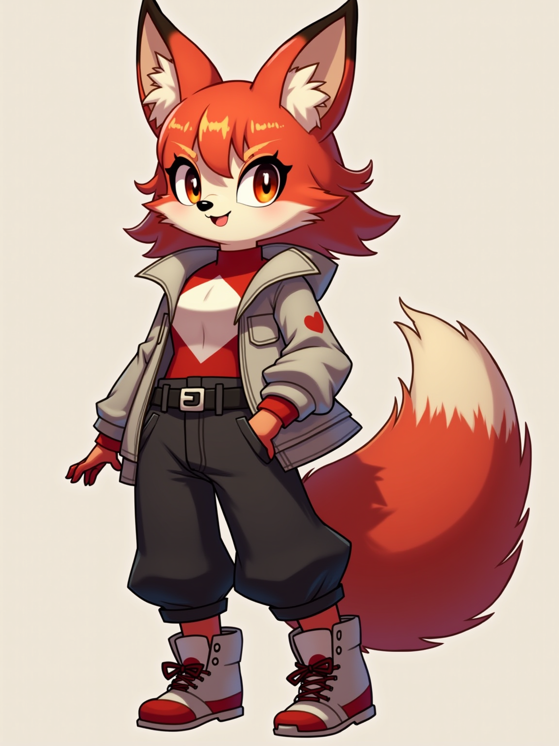 furry character of fox fursona of model with graceful vixen features, fluffy red and white fur, and cute fox ears , wearing trendy streetwear, playful expression, detailed digital furry art style