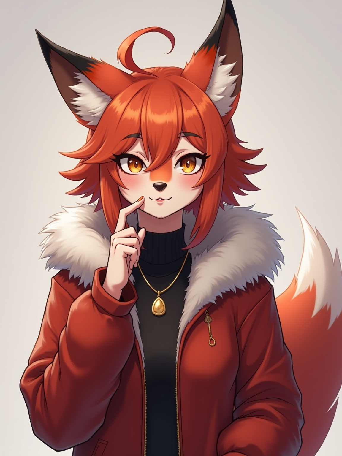 furry character of fox fursona of model with graceful vixen features, fluffy red and white fur, and cute fox ears , wearing trendy streetwear, playful expression, detailed digital furry art style