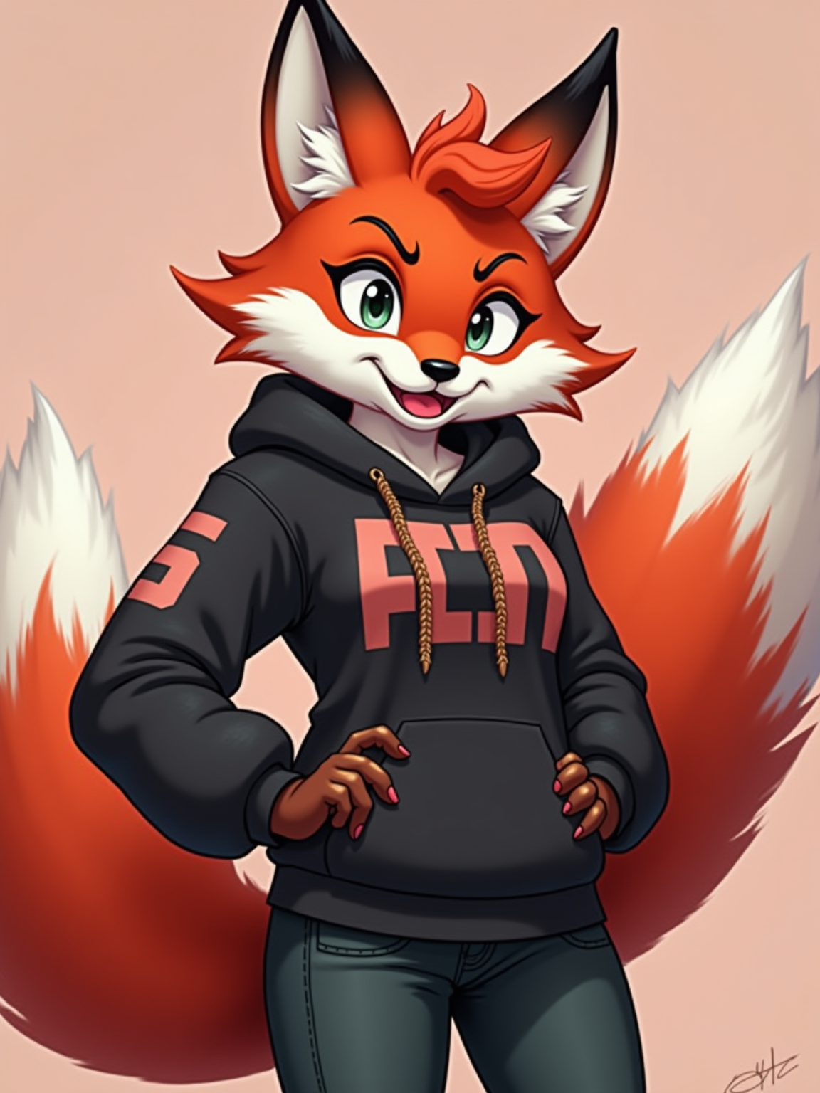 furry character of fox fursona of model with graceful vixen features, fluffy red and white fur, and cute fox ears , wearing trendy streetwear, playful expression, detailed digital furry art style