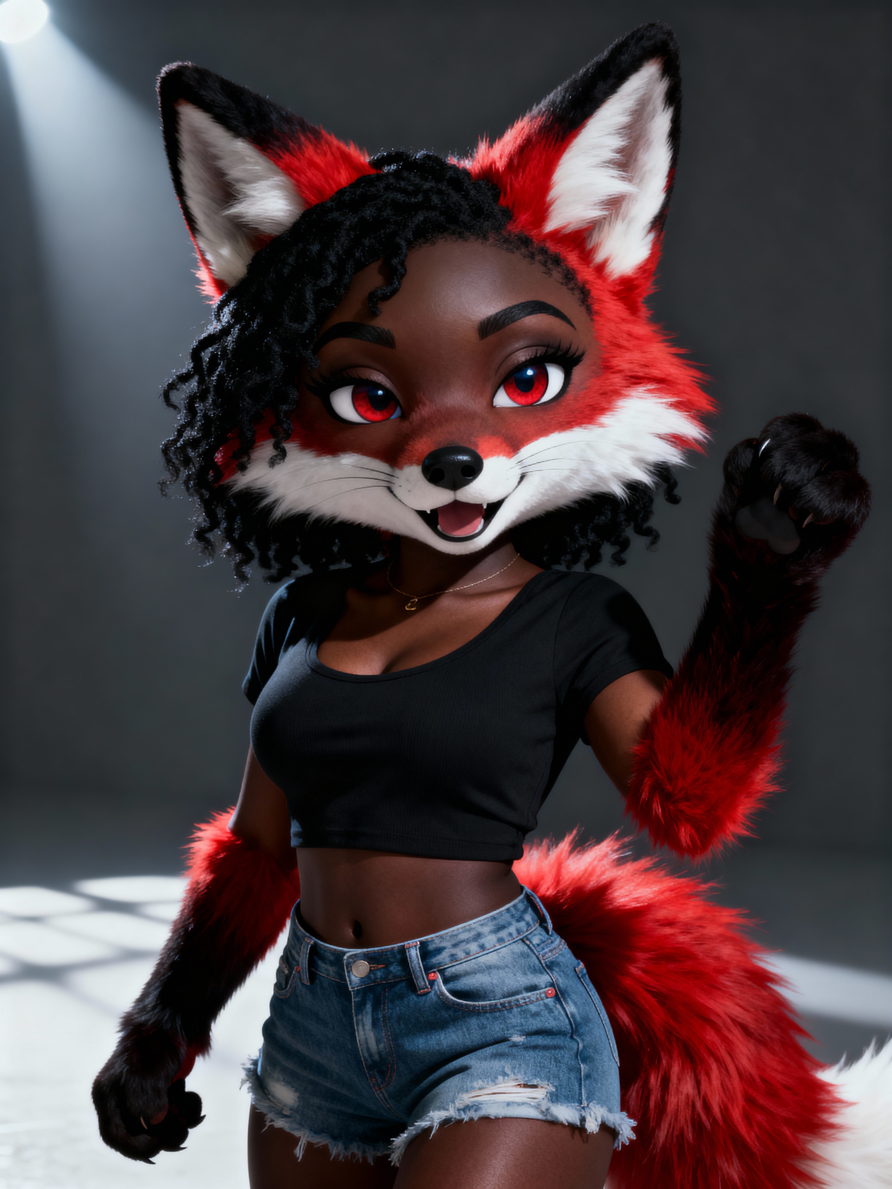furry character of fox fursona of model with graceful vixen features, fluffy red and white fur, and cute fox ears , wearing trendy streetwear, playful expression, detailed digital furry art style