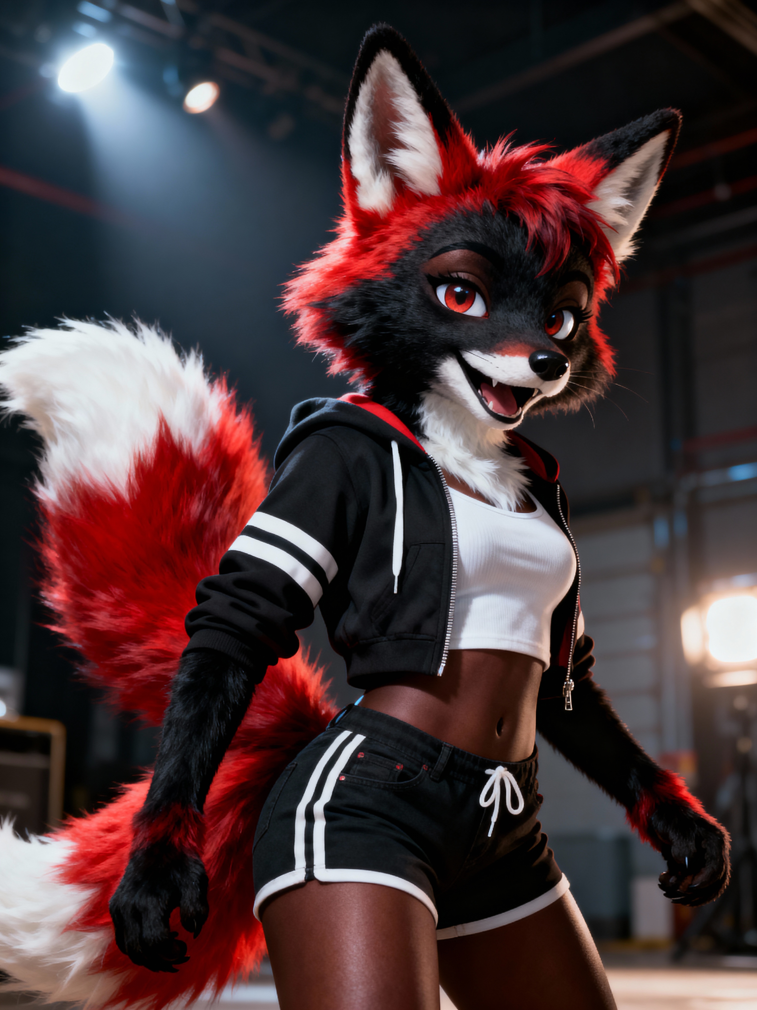 furry character of fox fursona of model with graceful vixen features, fluffy red and white fur, and cute fox ears , wearing trendy streetwear, playful expression, detailed digital furry art style