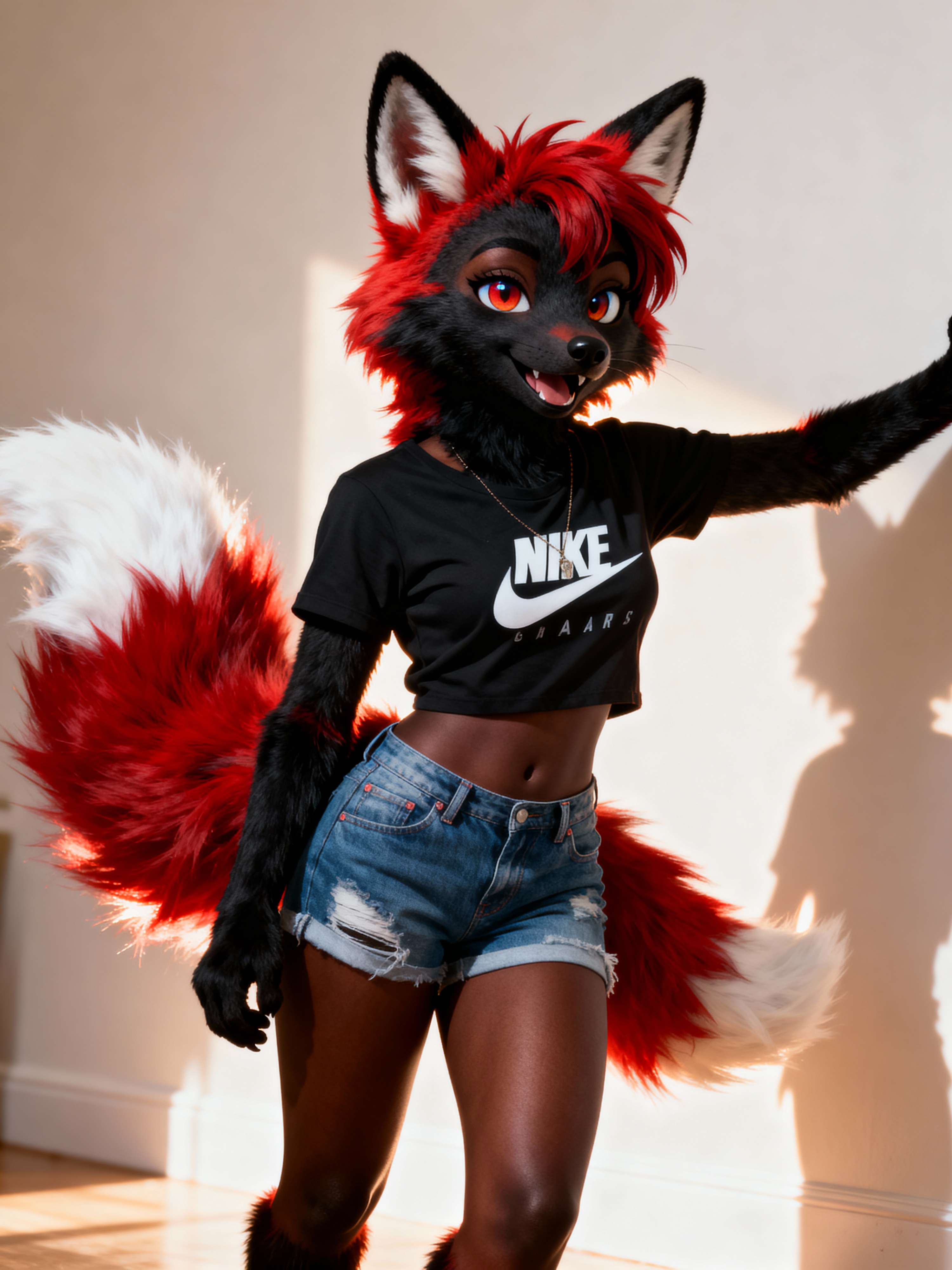 furry character of fox fursona of model with graceful vixen features, fluffy red and white fur, and cute fox ears , wearing trendy streetwear, playful expression, detailed digital furry art style