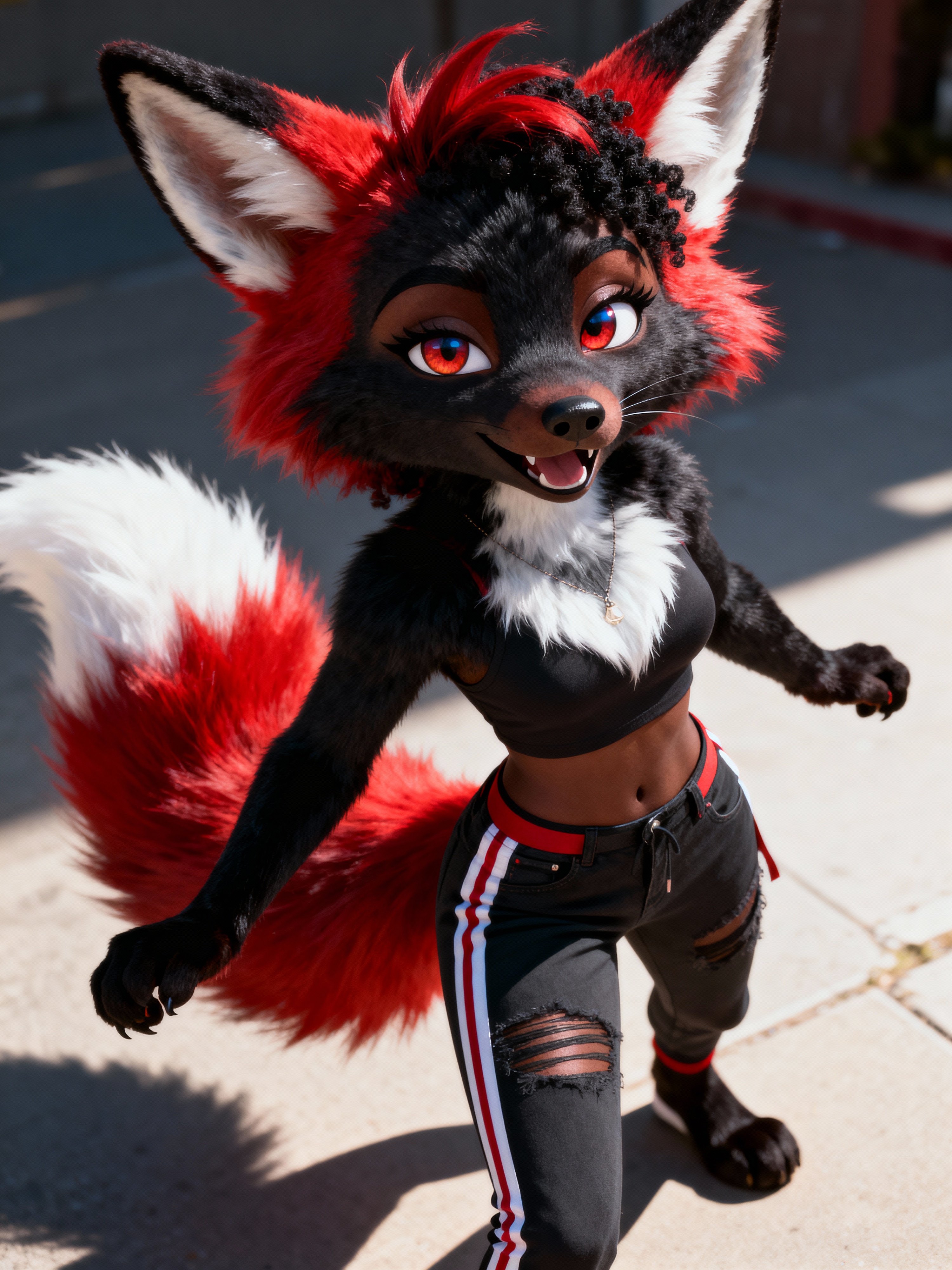 furry character of fox fursona of model with graceful vixen features, fluffy red and white fur, and cute fox ears , wearing trendy streetwear, playful expression, detailed digital furry art style